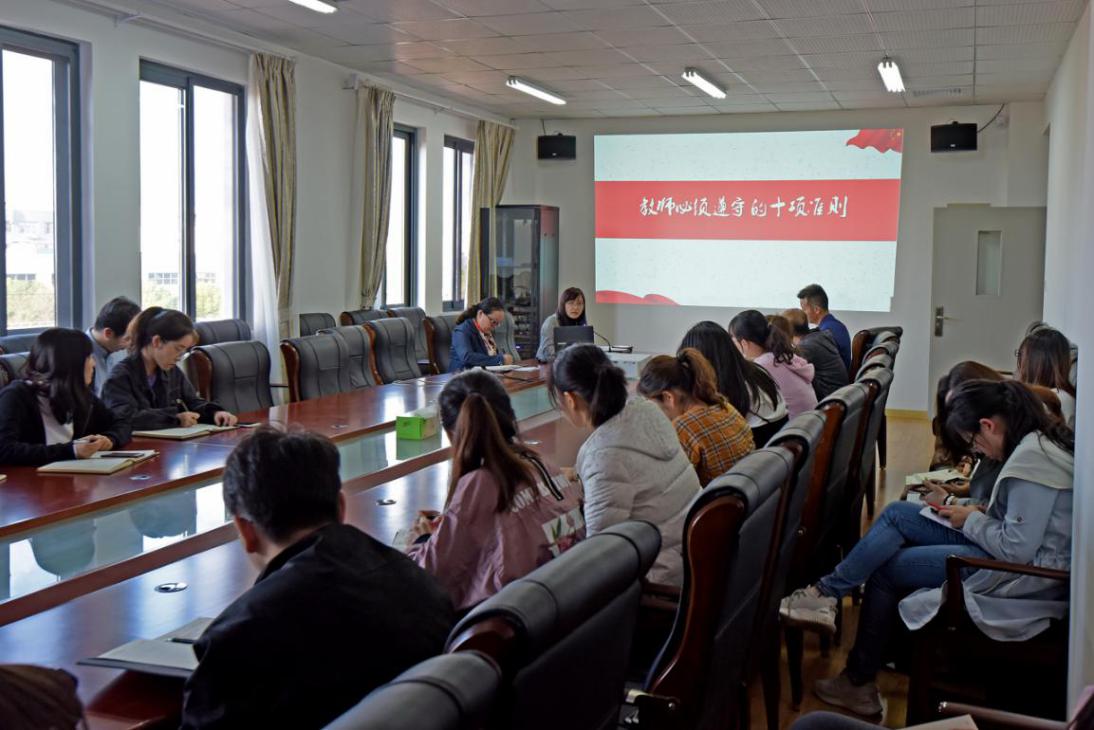 培训活动中,党支部负责人从做麦田里的守望者、做脚踏实地的实践者、做仰望星空的引领者,这几个角度帮助老师们明确教师必须担负的三种角色;从师爱、情怀、担当三个层面阐述了教师必须具备的三种素养;并从当下的热点事例出发,带领全体教师重点学习了教师必须遵守的十项准则。