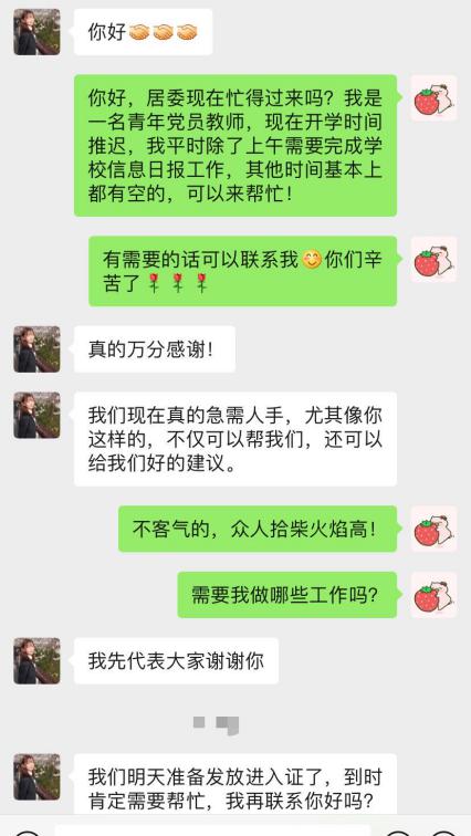 2月的午后,我校党员教师严苏伦来到所在社区居委,协同社区工作人员一同进行小区居民预约办理出入证和维持秩序的工作,开始了志愿服务。此前,她主动联系相关负责人,请缨加入社区志愿者服务的行列。她表示,作为一名党员,疫情当前,更应坚守初心、勇当使命、逆行而上,哪怕能尽的只是绵薄之力,也要尽全力去做!