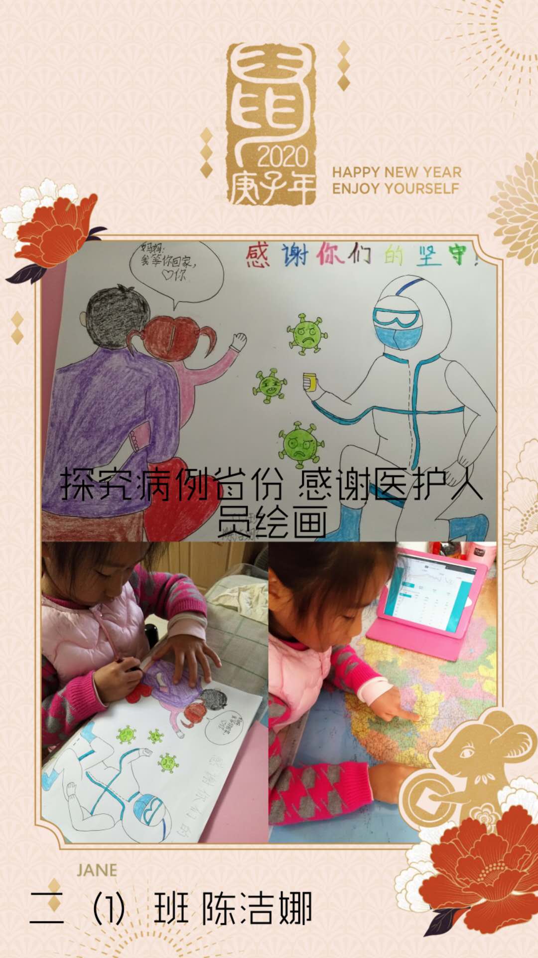 心存感恩的小画家:二年级的小朋友充分发挥想象的翅膀,虽然会写的字不多,但他们用图画代替文字。五彩的画笔描绘出斑斓画卷,他们用自己的方式简洁流畅地宣传防控小知识;他们最真诚地向他们心中最美逆行者表达祝福和感谢!