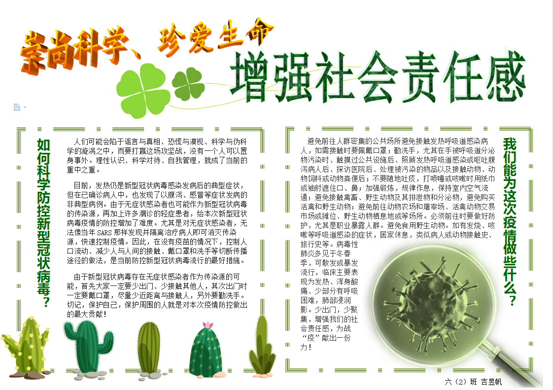 勇于钻研的科研家:六年级的哥哥姐姐们也用心制作了有关的科学小报以及对于本次重大疫情的自我感悟,一片片字迹工整的小作文,是由他们对疫情之严峻的担忧和强烈的爱国情怀交织而成。