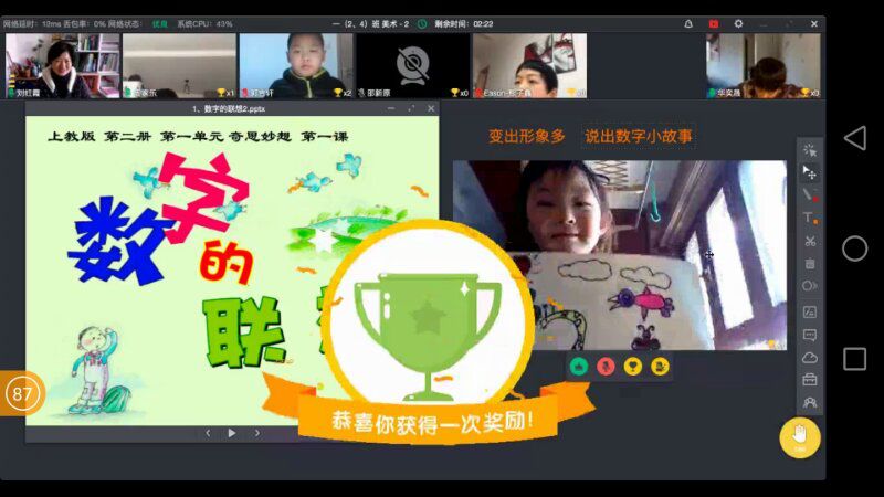 美术组:刘红霞老师:特殊时期,为了小朋能够健康成长,停课不停学相继开展,让老师们都当了一把主播老师。新颖的教学方式带来了新的挑战,美术,依然是学生最受欢迎的学科之一。线上教学,我的教学主旨依然是让学生“动起来”,但是不在课堂,也要提醒学生在画画时候需要注意的事项、课前的准备、指导学生在课堂上完成自己的作品。”每位小朋友的动手能力有差异,线上教学,怎样才能突出优秀作品呢?灵活运用电信classin平台的功能,让孩子们轮流上台,给每位小朋友一个展示的舞台,激发他们的学习兴趣,台上颁发小皇冠的奖励,更加促进学习动力,使学生积极地参与进去。