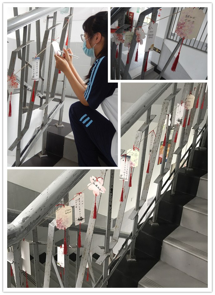 在活动前团委购买了祝福卡片和红绳,祝福卡片分至各个班级,高一高二的同学们在卡片上写下对高三学长的祝福,希望学长们在高考中超水平发挥,全部都能实现梦想,高三同学则写下自己的愿望和理想,写下自己希望考中的大学。所有的祝福卡片用红绳串起,挂在学校的走廊中,形成一道动人的风景。在活动的最后一天,高三同学取下自己心怡的祝福带走。