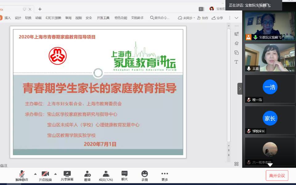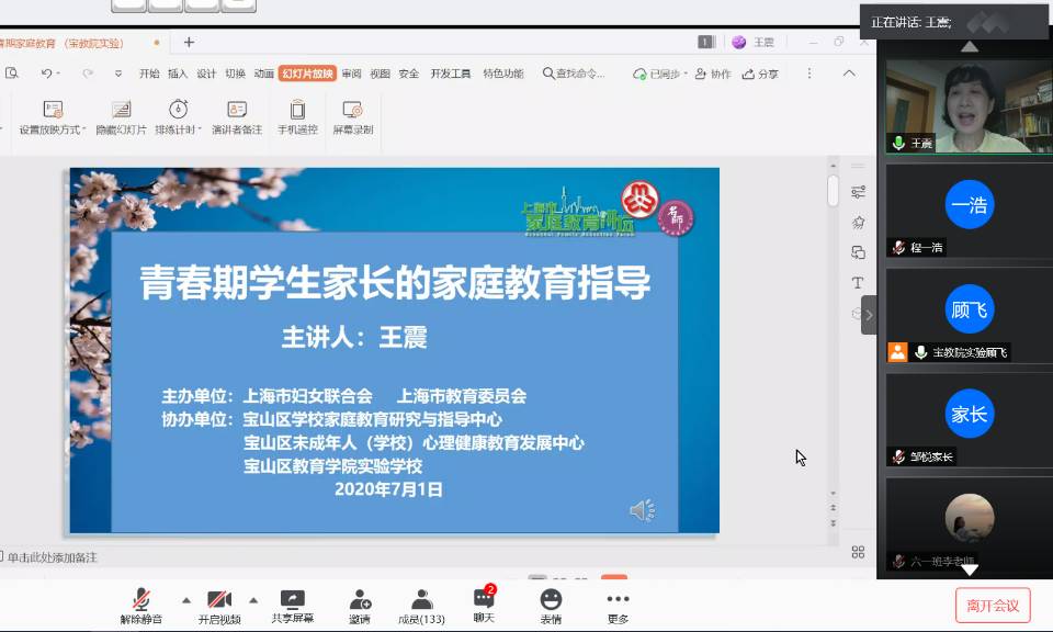为进一步促进家庭、学校、社会之间的交流,2020年7月1日,“青春期家庭教育指导进学校”宝教院实验学校专场在腾讯会议开设了讲座。本次活动是市教委、市妇联、市文明办为更好地服务家长、服务学校而联合组织开展,并由宝教院实验学校承办的免费公益项目。