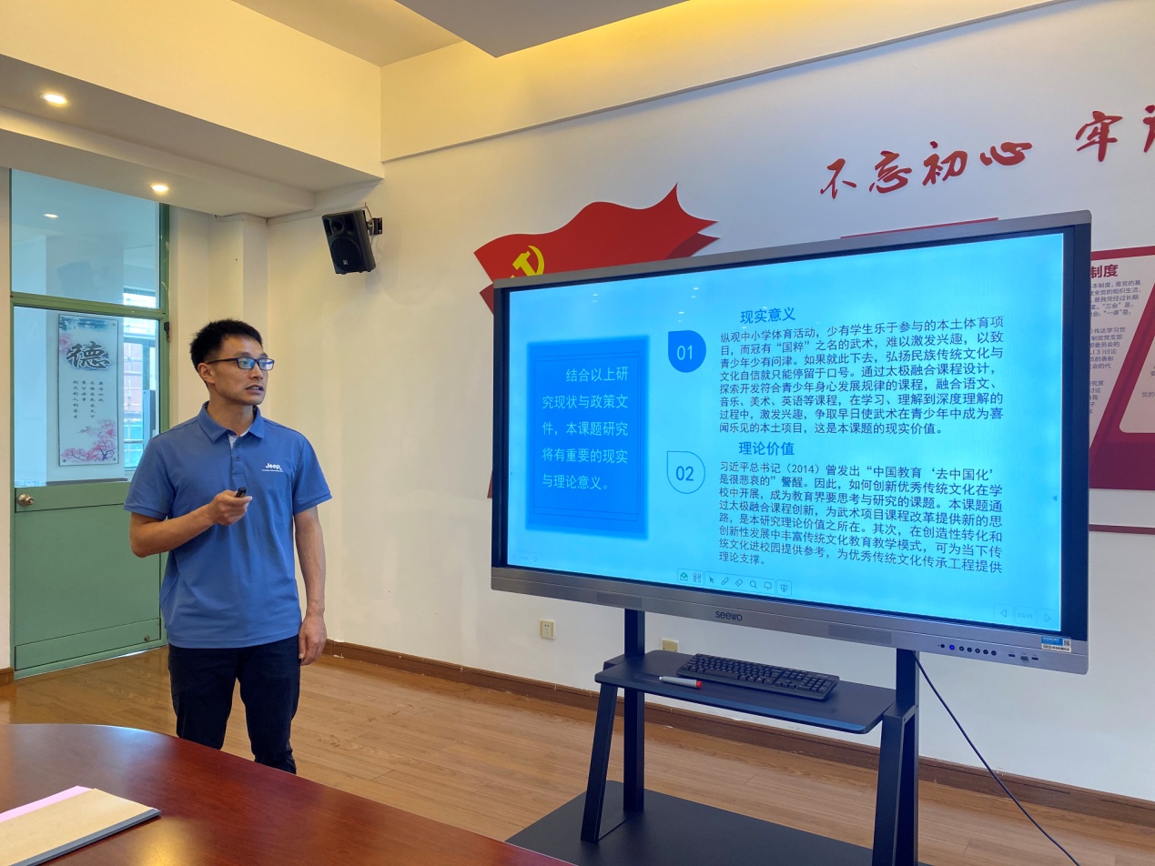 论证会上,课题组成员周老师从选题依据、研究内容、研究思路及方法、步骤与保障几个方面向与会专家介绍了学校的区级重点课题《以体育人:初中太极拳融合课程设计与实施研究》。