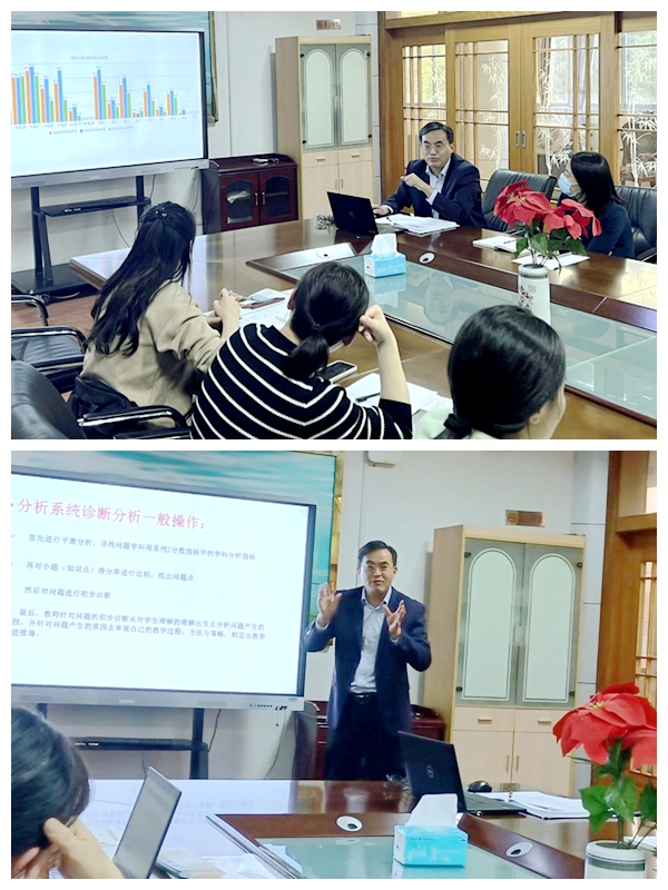 最后,校长杨建钢做总结发言。首先肯定了本次质量诊断能做到精准分析,查摆问题,提出措施,并表示,借助数据分析平台能更好地促进“教、研、学”,可以帮助教师更有针对性地采取应对措施,进而帮助学生实现“在错误中成长”。随后,杨校长又提出“向管理要质量”的要求,提出了教师要做到“五关注”,并强调,学生才是教师最好的“成果”。把学生们培养好,是教师教学成果的最好展示。