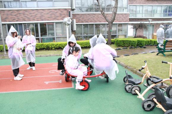 春雨淅淅沥沥地下着,穿上雨披雨鞋的孩子们感受到了不一样的游戏体验,小雨成了他们游戏的新情景,草坪上忙碌的蚯蚓带给了他们新的畅想;如何防滑,如何在雨中玩得既尽兴又安全,孩子们在不断地思考与探索。在这里,与会人员看到了孩子们自主愉悦、快乐探索的户外游戏状态以及教师基于儿童视角的信任、陪伴与观察。