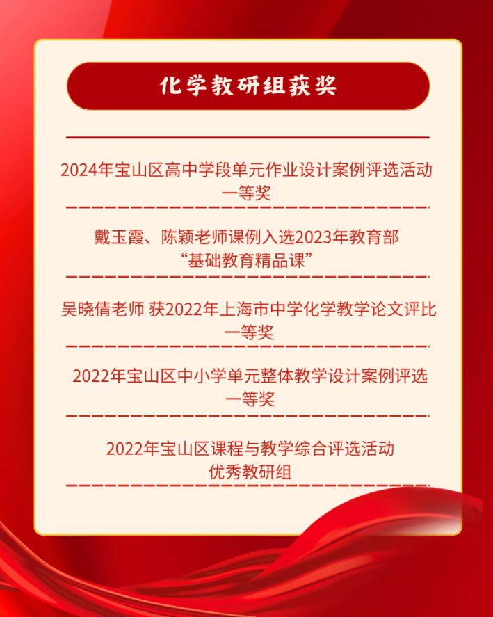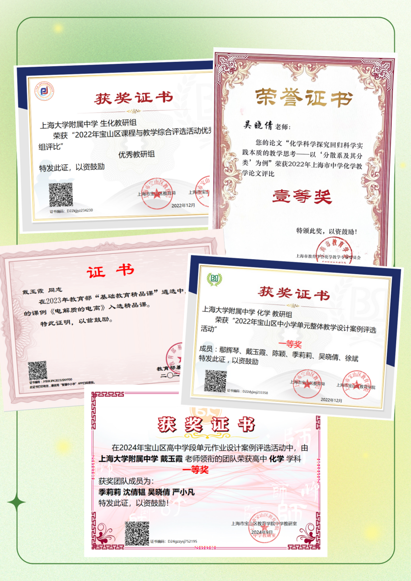 近两年,组内教师在市区级教学评比活动和学生竞赛指导获奖上硕果累累。指导学生在中国化学奥林匹克竞赛中获二等奖1人、三等奖3人;上海市高中生化学竞赛中获三等奖1人;上海市青少年应用化学与技能竞赛中获一等奖1人、二等奖1人、三等奖6人;上海市明日科技之星中获二等奖1项;上海市青少年科技创新大赛化学相关领域中获二等奖1项、三等奖4项;宝山区青少年“白猫杯”应用化学与技能竞赛中共获奖41人;宝山区高中化学竞赛中共获奖14人等。