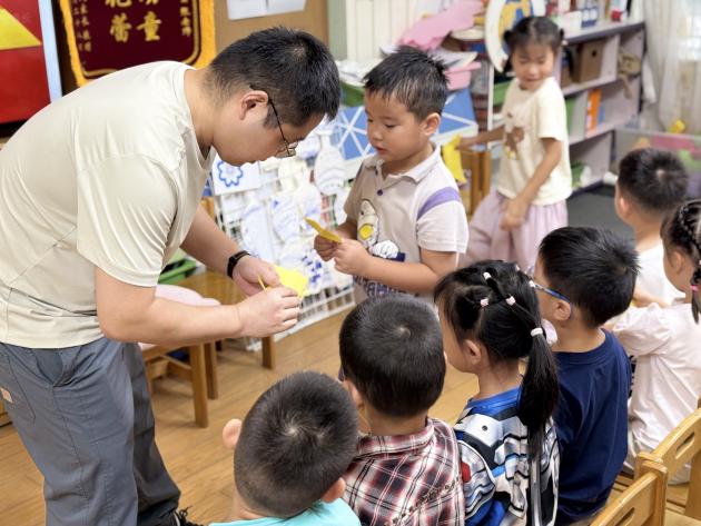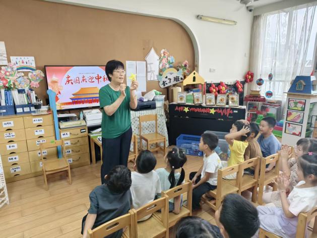 “家长进课堂”率先为国庆月拉开红色帷幕。各班级家长结合自身优势,带来了形式多样的红色课堂:有的家长用生动的动画片段和趣味问答,为孩子们讲述国庆节的由来,让孩子们知道“十月一日”是祖国妈妈的生日;有的家长带领孩子齐唱《我爱北京天安门》,稚嫩的歌声里满是对首都的向往;还有的家长捧着《刘胡兰》《鸡毛信》等红色绘本,用跌宕起伏的情节和形象的肢体动作,还原小英雄的勇敢故事;部分班级的家长还准备了红纸,手把手教孩子们折小红星,当一颗颗鲜红的星星在手中成型,孩子们的脸上都洋溢着自豪的笑容。