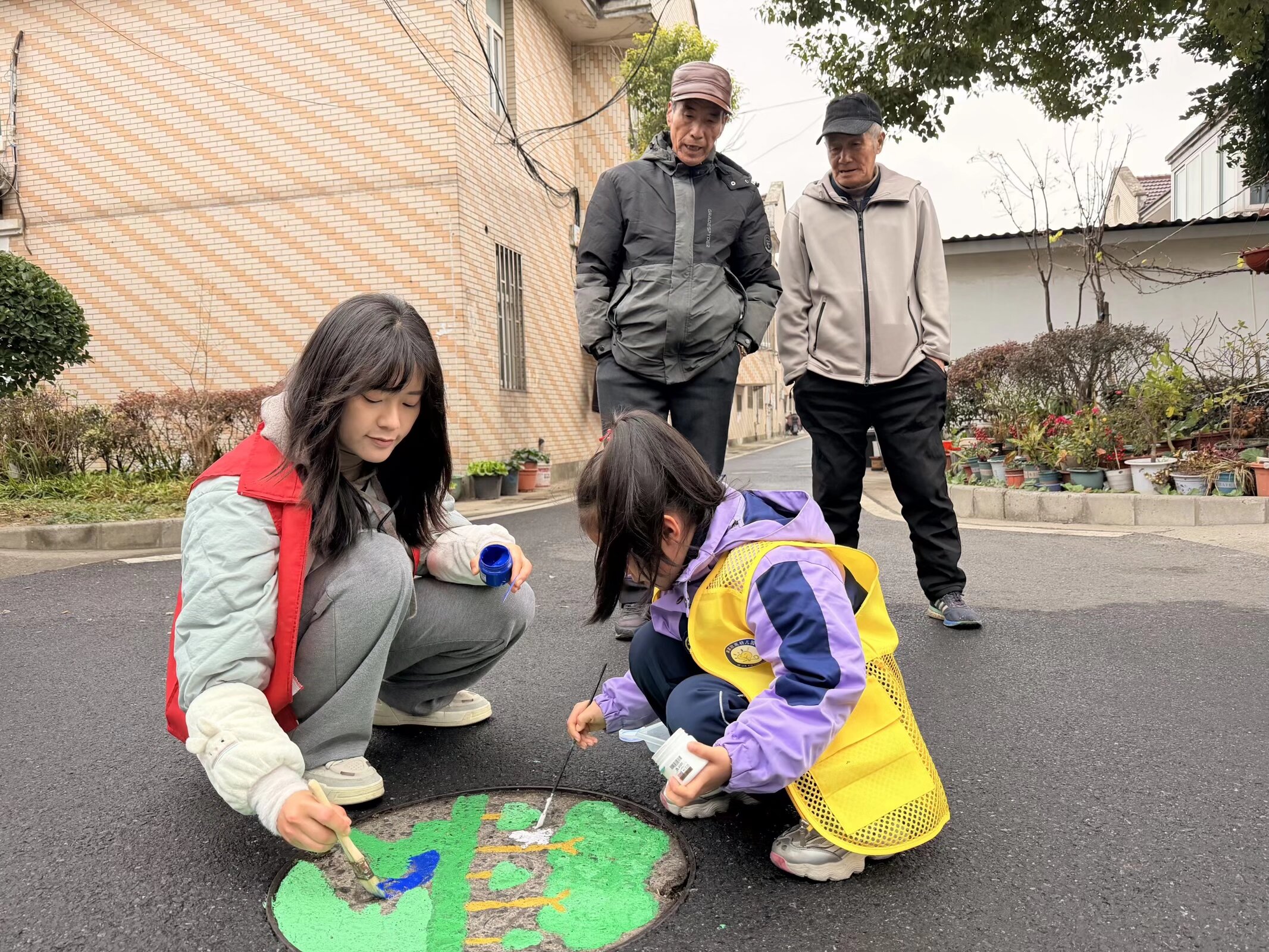 杨行镇大黄村活动现场暖意融融,党员教师化身志愿先锋,秉持“奉献、友爱、互助、进步”志愿精神,大手牵小手,带领孩子们围站井盖旁尽情创作。这既是“让师爱扎根教育一线”的生动践行,更是幼儿园“龠”党建品牌扎根乡土、服务社会的理念落地。
