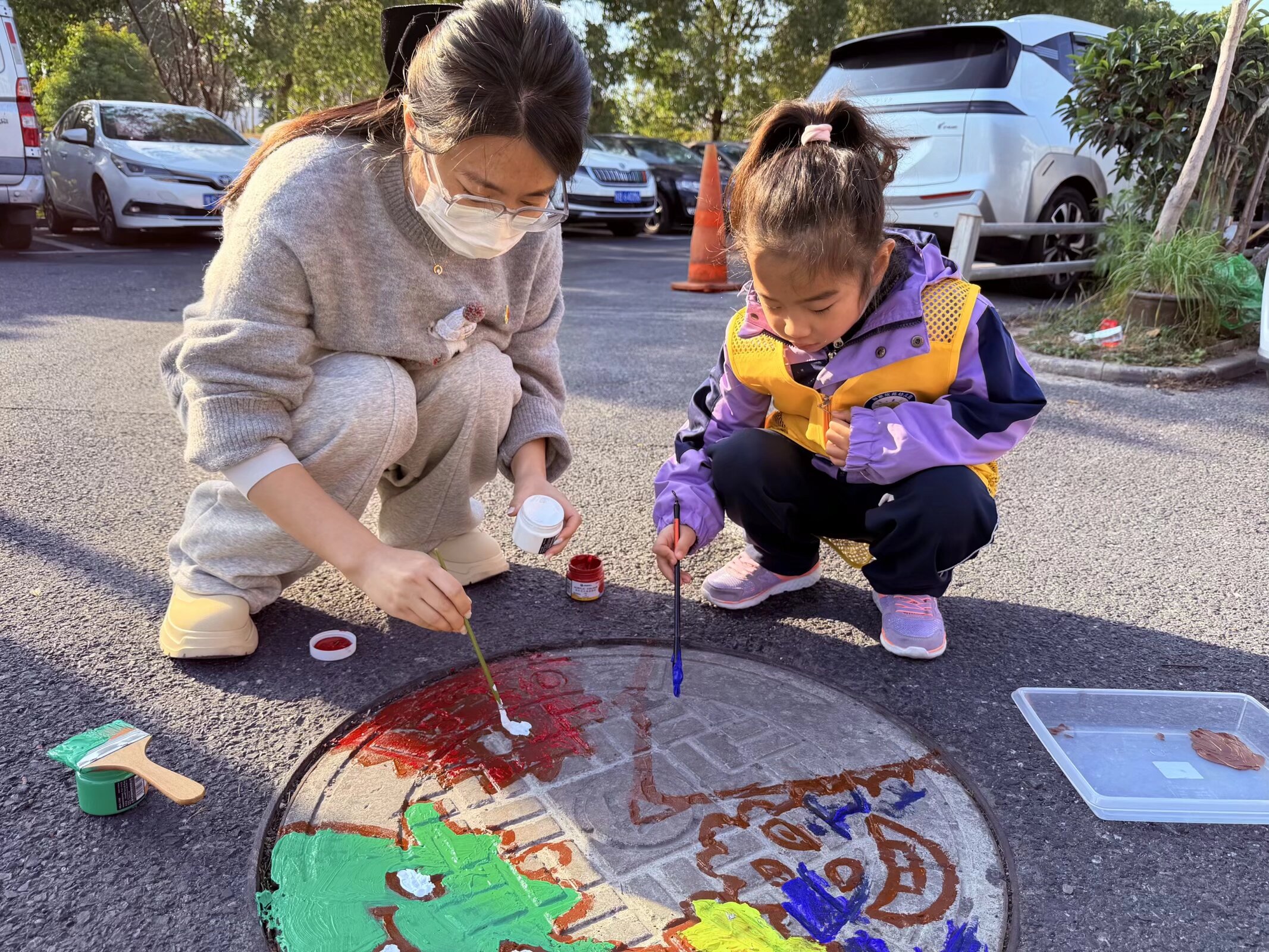 围绕“文明城市”“绿色家园”“童趣童梦”三大主题,宝贝们蘸取多彩颜料,发挥奇思妙想,一笔一画认真勾勒,原本灰暗单调的窨井盖,渐渐穿上了鲜艳亮丽的“新衣”,卡通小动物、翠绿小树苗、文明小标语跃然“盖”上,普通井盖华丽变身成社区里一道灵动又治愈的风景线!