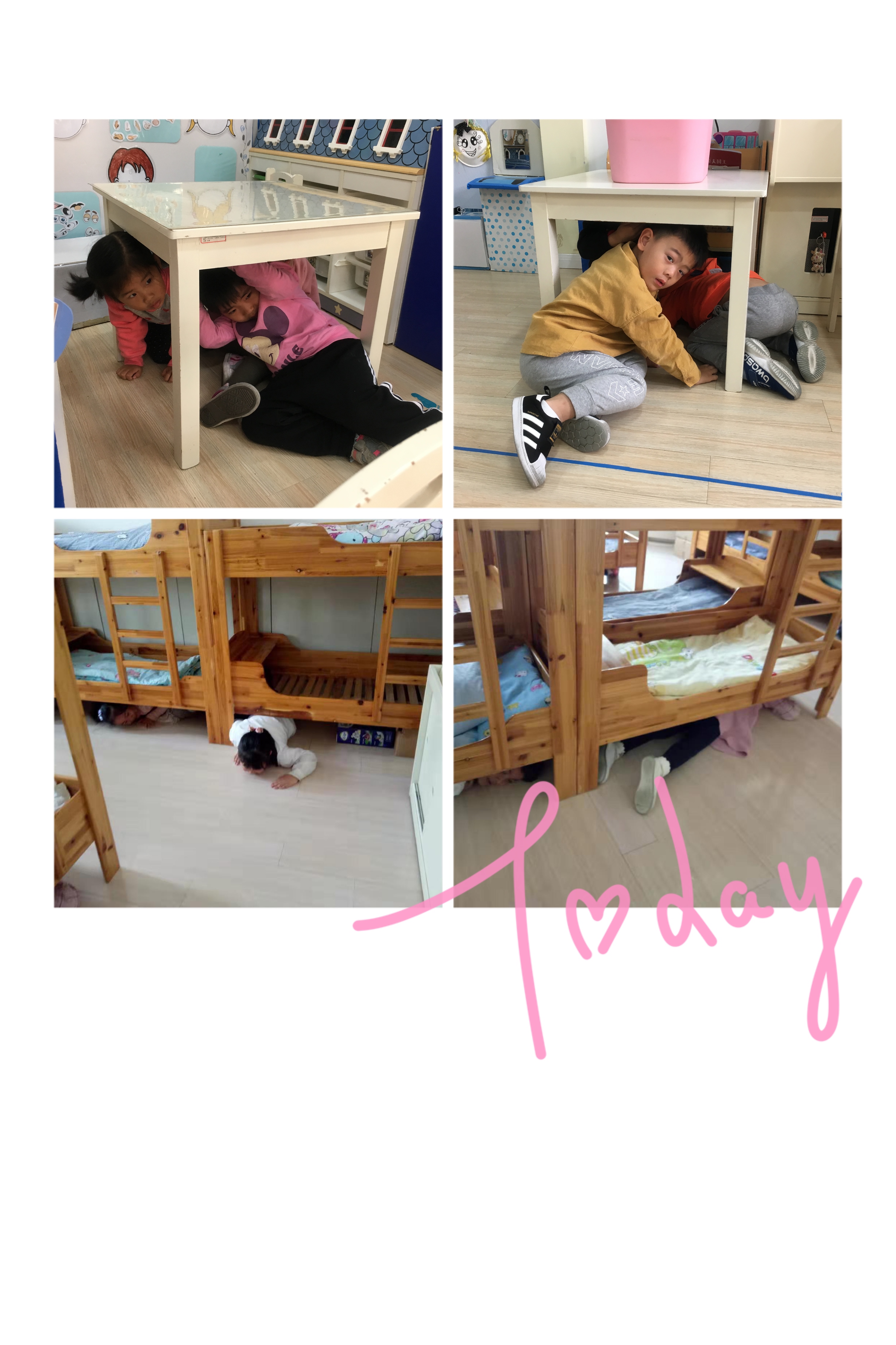 随着警报声的突然响起,各班老师立即有意识地组织幼儿抱头躲进小床及桌子底下,随即沿着安全路线弯腰低身快速有序地撤离教室。