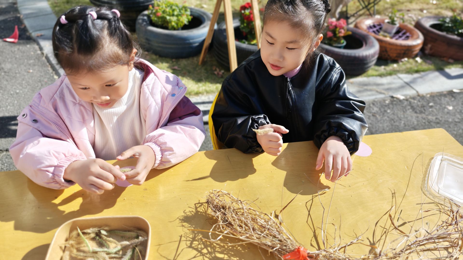 ★探秋·自然中的好奇:以狗尾巴草为素材,孩子们分组设计“拍拍乐”“捏捏乐”游戏,制定规则后化身“小摊主”邀请同伴参与,还分享植物小知识,在探索中点亮好奇心。