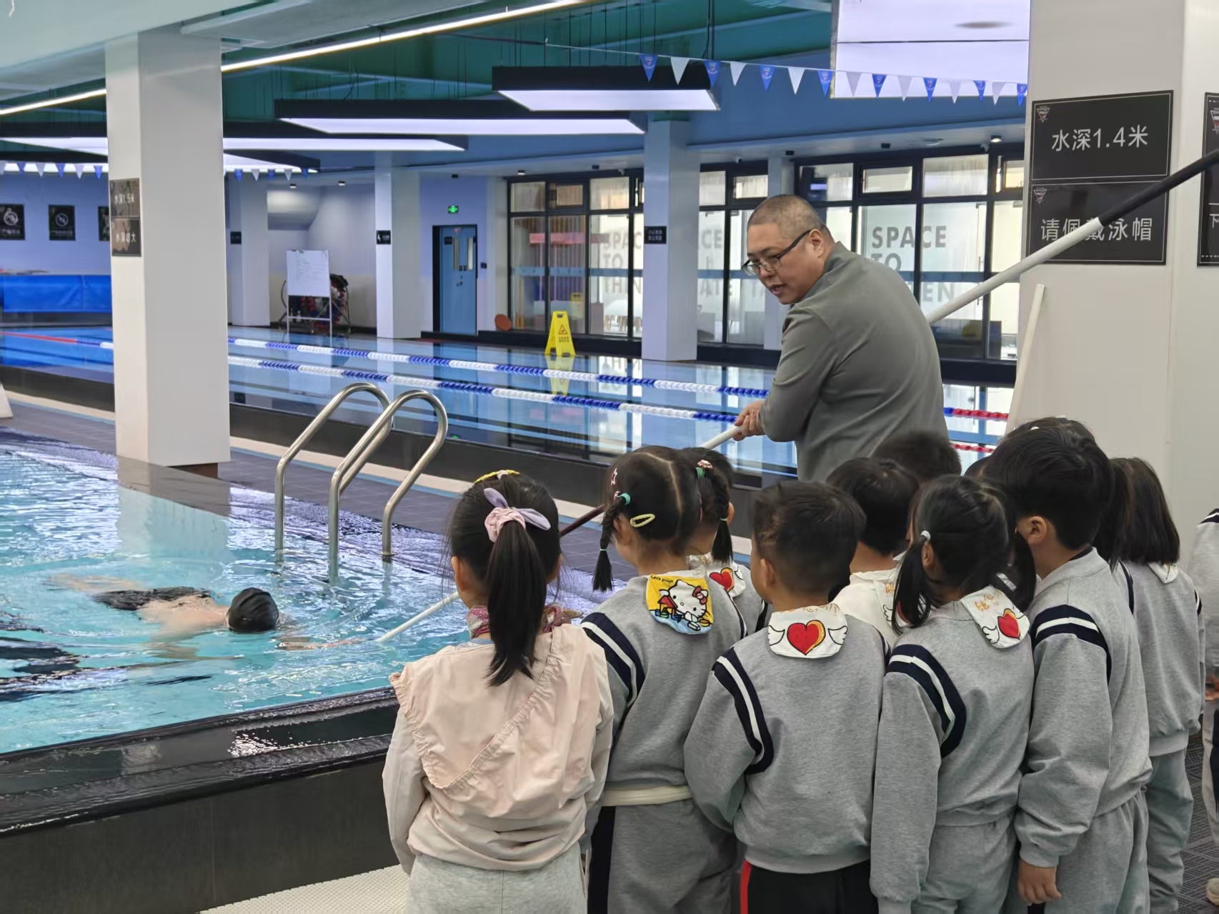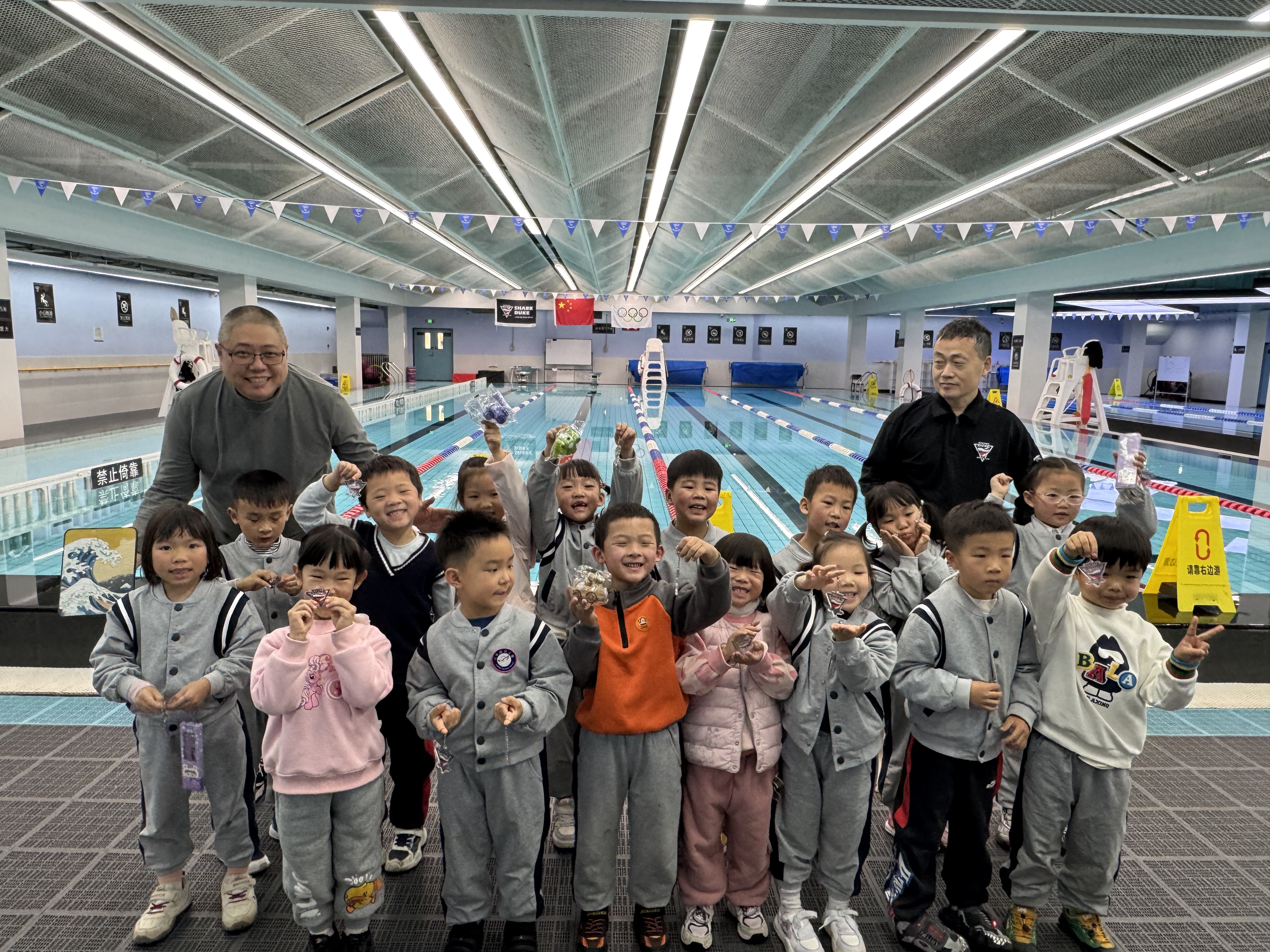 在鲨鱼杜克游泳馆,幼儿在教练的带领下参观了救生观察台、防滑地面等安全设施,了解其保护作用。通过现场观摩,了解落水后如何自救的方法。