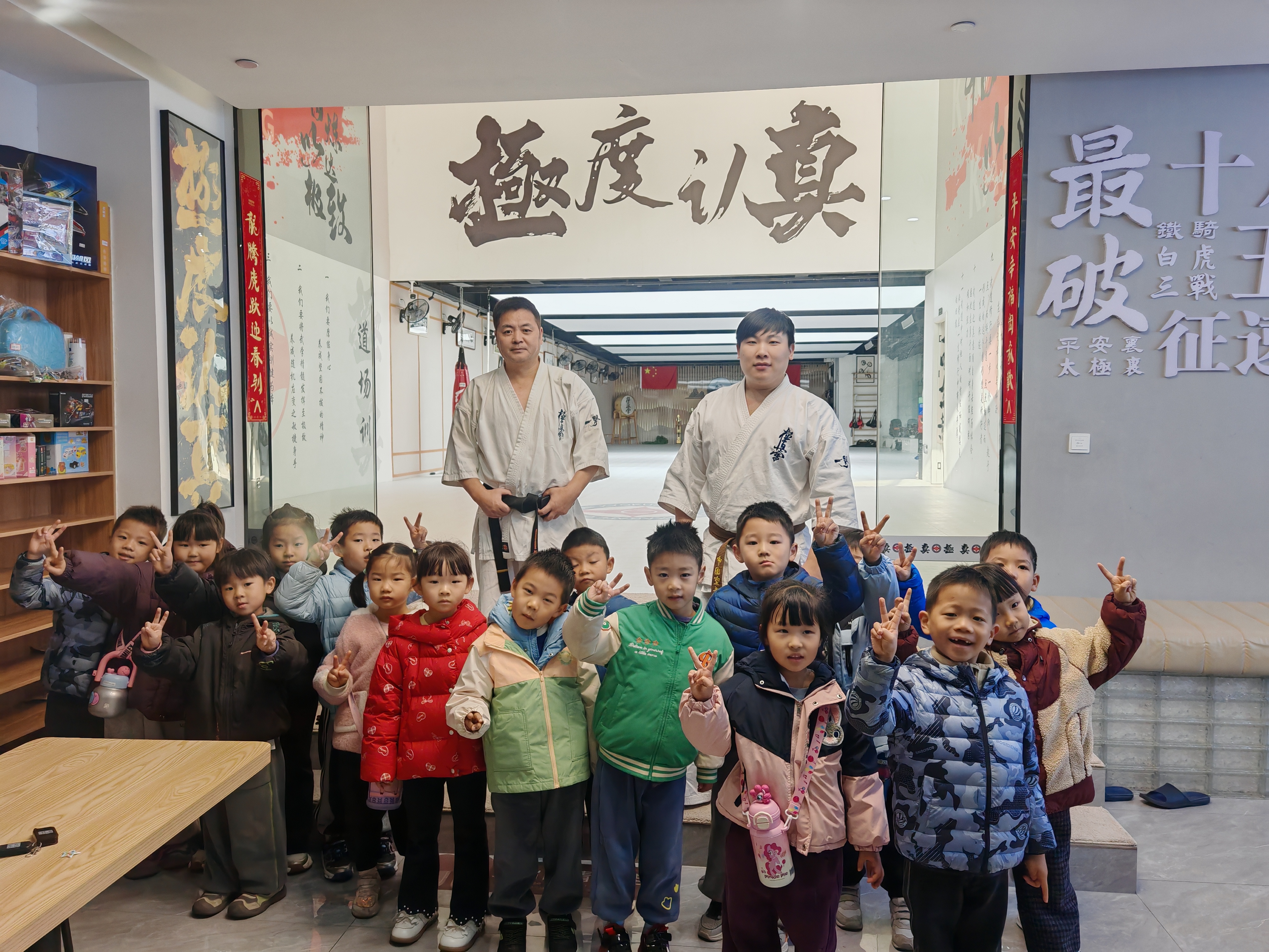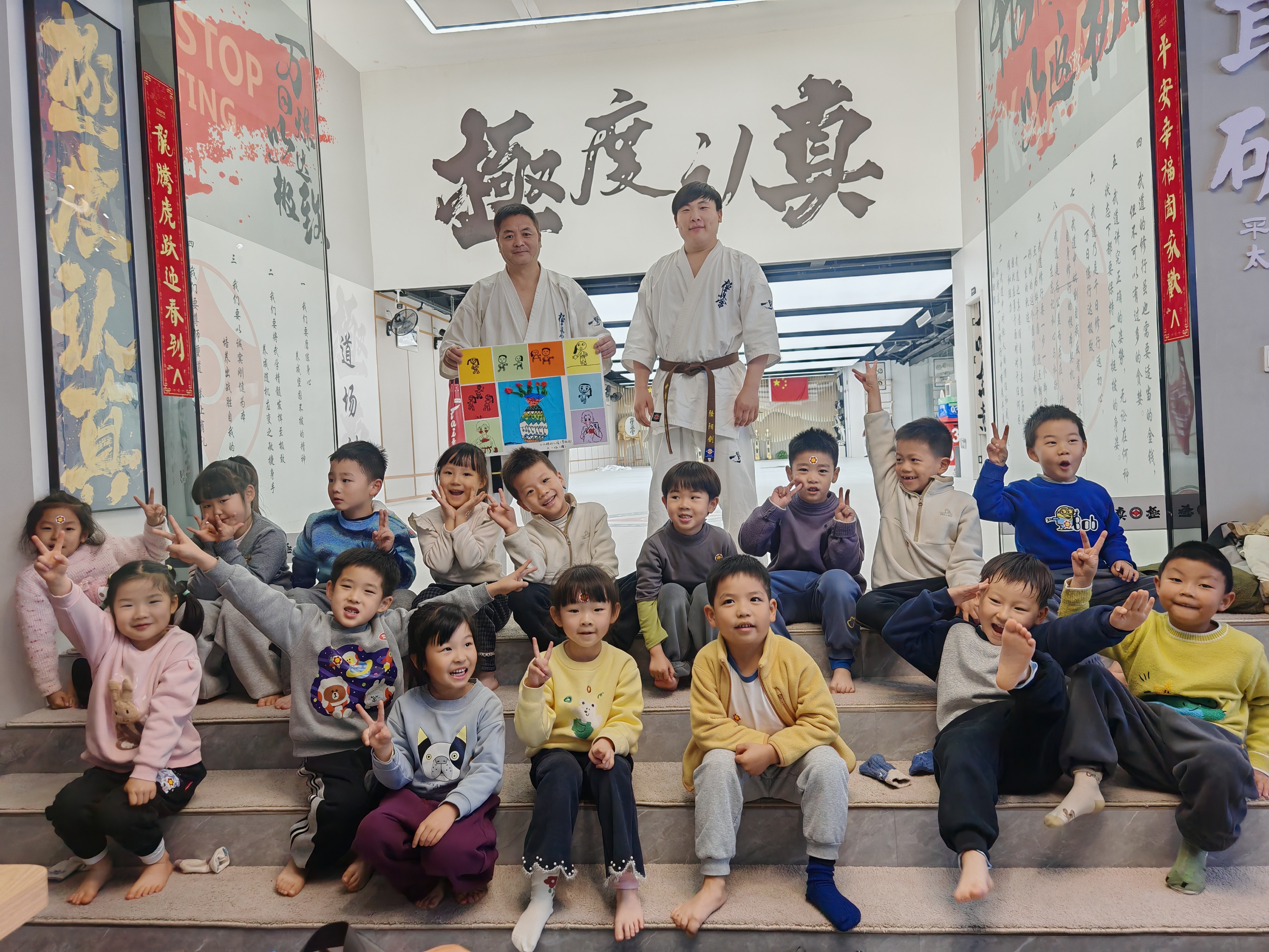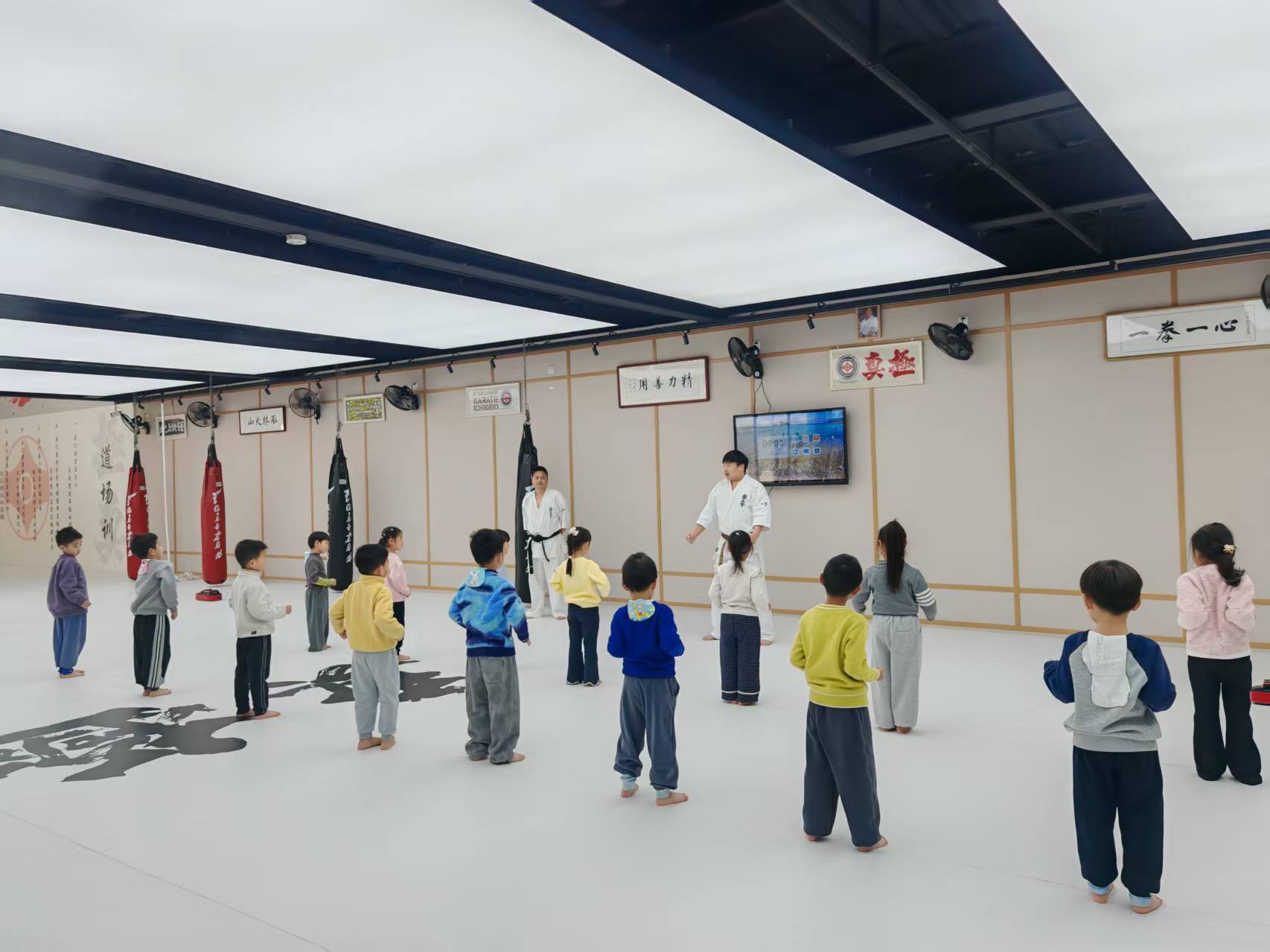 与此同时,另一队幼儿在极真空手道馆也开启了别样体验。教练通过图片、视频等形式介绍了空手道的起源与礼仪、运动健儿为国争光的小故事等,激发幼儿兴趣。随后,幼儿们跟随教练学习握拳、出拳等基础动作,感受空手道的魅力。