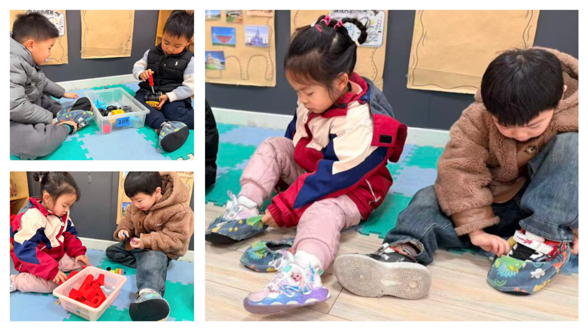 区域游戏中的保暖防护同样细致,幼儿园为孩子们准备了柔软保暖的专属游戏鞋套,幼儿在进入游戏区域时可以更换,既能有效隔绝地面凉意、保护小脚丫不受寒,又能避免活动时鞋袜滑落着凉。与此同时,教师带领幼儿学习自主穿脱鞋套,让保暖防护与生活能力培养相结合。