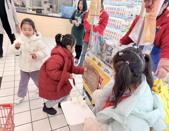 家长们全程耐心陪伴,不催促、不干预,引导孩子查看超市指示牌寻找商品,鼓励孩子用礼貌用语沟通,并不时与孩子交流“现在的超市商品更丰富”“智能设备让购物更便捷”等感受,让孩子们在实践中直观体会超市发展带来的便利。