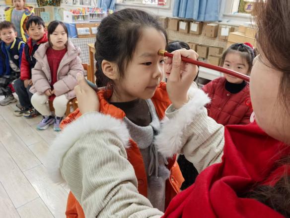 每个班级的朱砂启智活动中,老师们身着中式服装,为孩子们轻点朱砂,开启智慧之门,在传承传统文化的同时,也为孩子们的新学期送上美好祝愿。