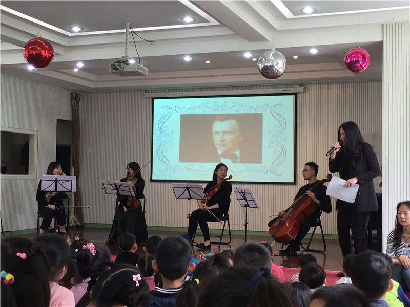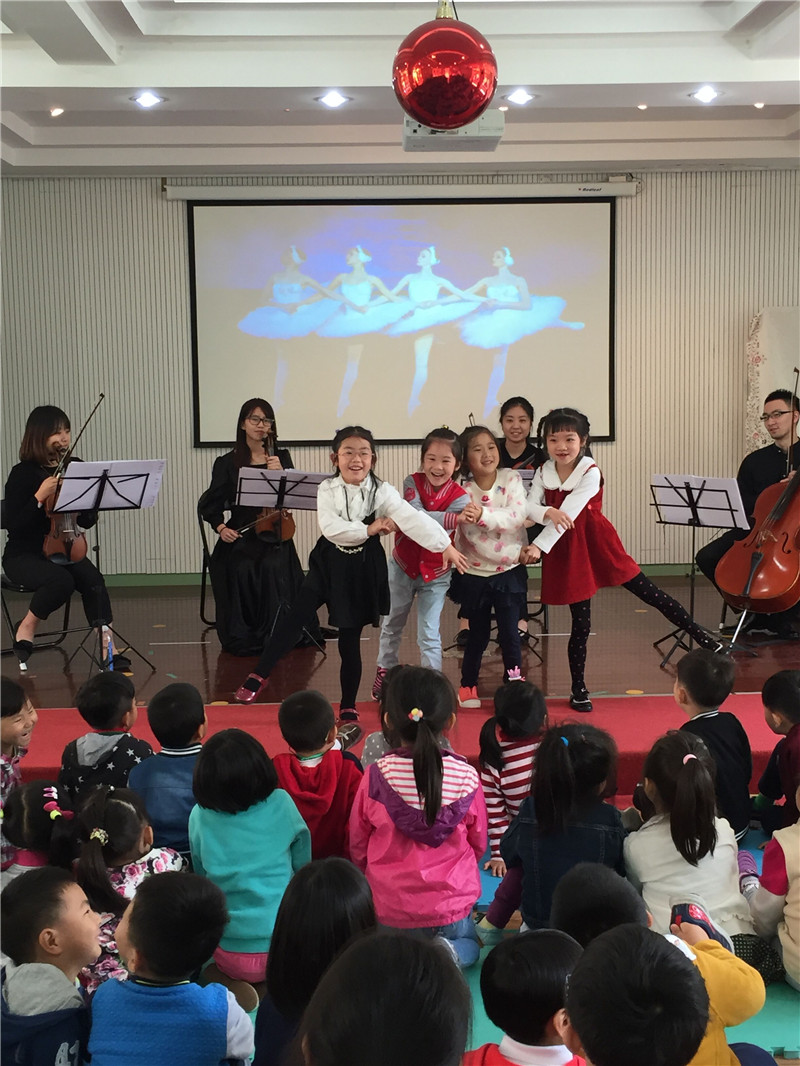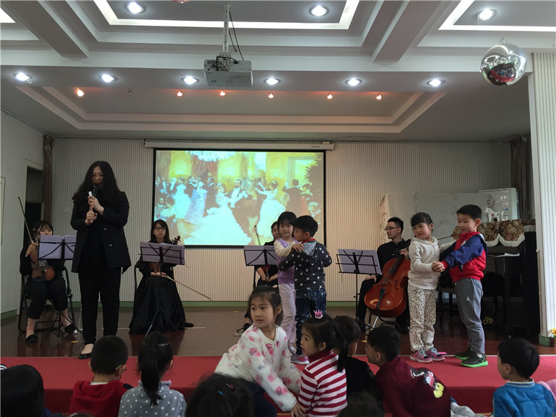 5月10日上午,七色花艺术幼儿园举行第六届艺术节系列活动之——走进艺术,特邀彩虹乐队的乐手们带来精彩的“弦乐四重奏”。彩虹乐队为我们带来《小夜曲》、《蓝色多瑙河》、《幽默曲》、《巡逻兵》、《四小天鹅舞曲》、《快乐农场》、《天空之城》和《欢乐颂》共八首经典乐曲。每首乐曲曲终,乐团老师都会介绍作曲家和乐曲的背景,同时组织孩子们近距离互动。