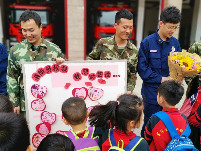 活动结束的时候,为了表达对消防员叔叔的崇敬,孩子们还开展了献花仪式,孩子们把一句句暖心的话语送给了消防员叔叔,消防员叔叔们开心的笑了!