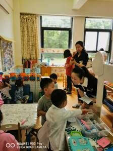 指导团成员们观摩了小班5个班级幼儿的角色游戏现场,虽然是刚入园三周的孩子,但孩子们在游戏中的表现:简单的交往对话,典型的角色行为等等,让大家看到了孩子们的“精彩”“趣味”。