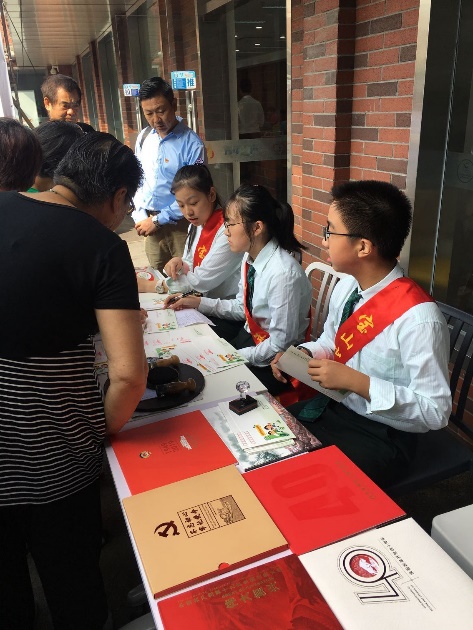 9月29日,由宝山邮政局、友谊路街道、宝山少年邮局(小陶子邮局)共同主办的“我和我的祖国”庆祝中华人民共和国七十周年系列活动在友谊路街道隆重举行,活动分主题邮展、邮票党课和现场服务三个环节,我校小陶子邮局的师生们参与了活动并进行了现场服务。