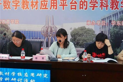 教学研讨时,首先由两位开课老师分别对自己的这堂课从设计到实践做了说课与反思,项目试点学校教师代表、我校教研组教师代表也分别加以点评;接着,区教育学院初中数学教研员钟文丽老师、地理学科教研员谭志良教师分别从学科角度、学科与数字教材融合应用角度,对两位开课教师提出建议与意见;随后,信息技术应用教研员何巍老师从如何让数字教材在最普通的教室实施教学进行了发言,杨行中学的这节地理课给全区所有的平常教室的日常教学带来示范引领作用。