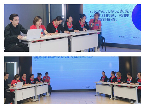 教研现场,太阳花的教师们围绕环节优化以美术集体教学活动《跳舞娃娃》为例,通过亮观点、提质疑,微辩论等形式进行思维碰撞。聚焦研点“范例”将活动推向高潮。话题引发了大家的共鸣,教师们也在论述、倾听、反思中梳理了一些“环节优化”的要素。