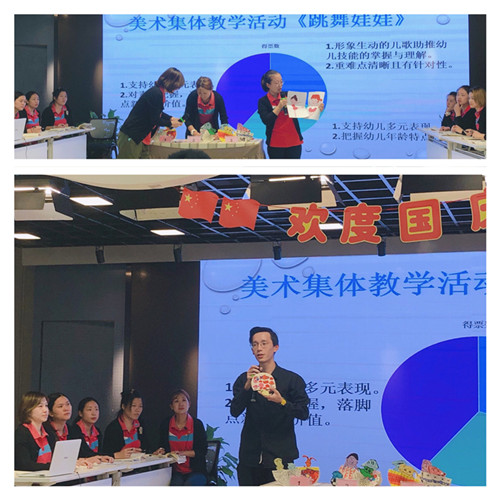 通过第一轮“咬尾式”园际间互动教研,宝山区太阳花幼稚园团队的教师们展示了他们的现场教研:《美术集体教学活动中的环节优化》