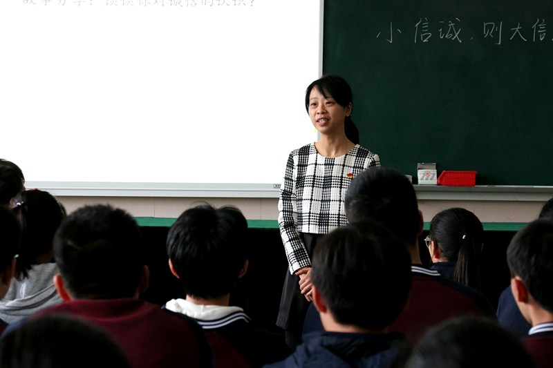 薛萍老师以“小信诚 则大信立”为主题,通过问卷、故事分享、视频观看、诚信储能卡等手段,由浅入深地引导学生切实感受诚信的意义,明白生活处处皆诚信。课堂注重学生的体验和反思,结合家长、任课教师、社会等多方面力量,多角度、多层面达成教育目标。