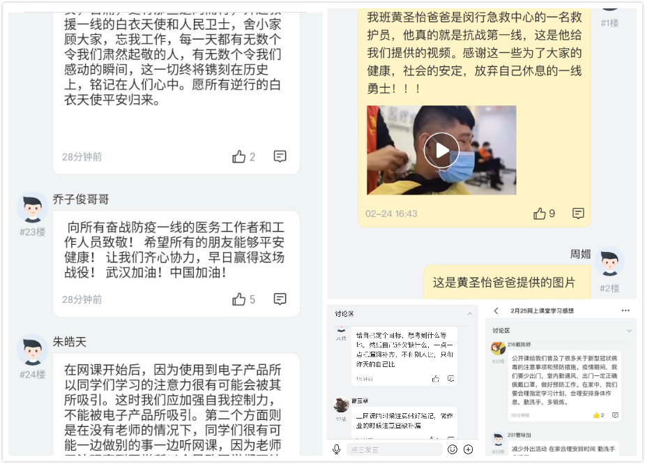 本次班会课分为两个篇章:观摩上海市《中小学防疫公开课》,随后德育处组织开展防疫云主题班会。在晓黑板互动平台上各班级师生协力合作,设计了形式多样的云班会,内容既有“调整情绪,安心居家”、“抗击肺炎,众志成城,自主学习,保持成长”、“自主学习,自信面对”等防疫进行时,也有“加油武汉!加油中国”“致敬最美逆行者”、“武汉加油——致敬所有抗疫一线工作人员”等培根育魂教育。同学们纷纷畅谈观看防疫公开课的感想,交流了自己如何进行防护的措施,一些同学的家长正工作在医护人员的一线,他们表达了对自己家长的担心但又为他们感到自豪,师生们也纷纷向他们致敬。此外,对于特殊在家学习的日子,老师们对同学们的学习安排和心理调适进行了科学有效的指导,同学们也纷纷晒出了自己的作息单,表示自己将合理的安排好时间,做到学习,生活两不误,做到视力不减体重不增。