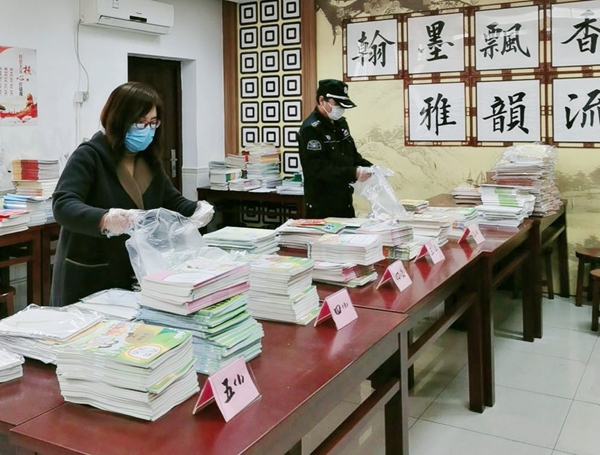 分发教科书:疫情期间,为保障全校师生能按时领到新学期教材,顺利在家参加线上教学活动,党员们在党支部带领下对全校教材进行分装整理,分类、叠放、消毒……彼此间没有过多的话语,党员们配合默契,有条不紊,细致高效。在这次特殊时期的特别行动中,党员老师们作表率亮身份,以实际行动服务学生和家长。大家说:“撸起袖子加油干,这是我们抗疫的姿态,也是我们坚守的信念!”