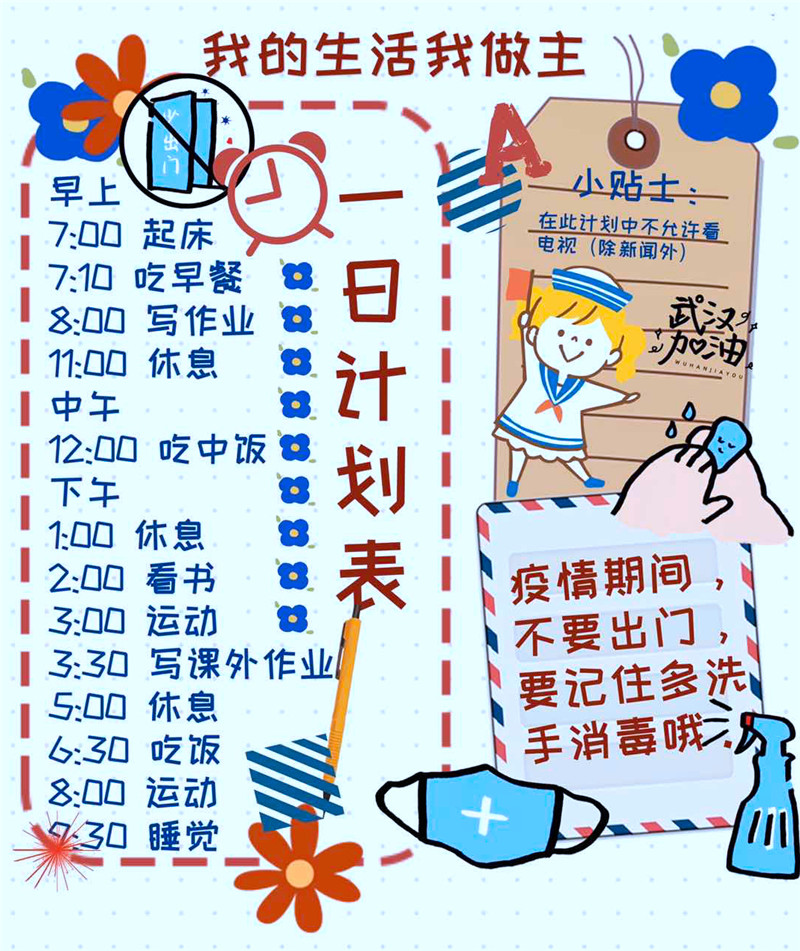 安静的空间、整洁的桌面、文具和书籍、一颗自我期许的心……这是每一天居家自主学习正确的打开方式,我的生活我做主,看看“一日作息表”,唤醒自己的自控力吧!