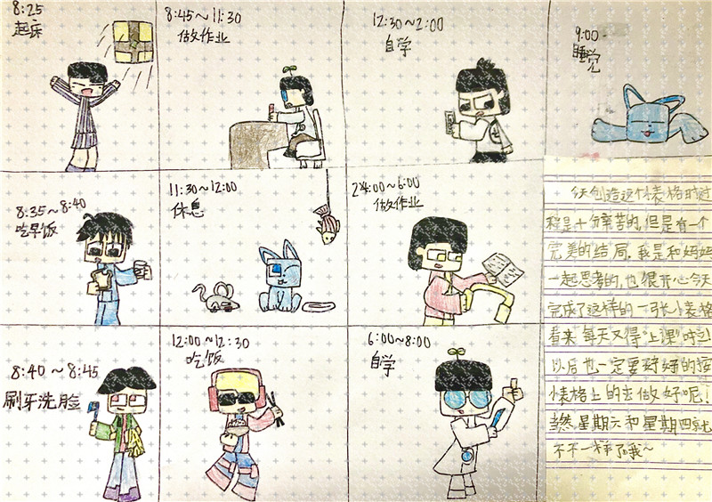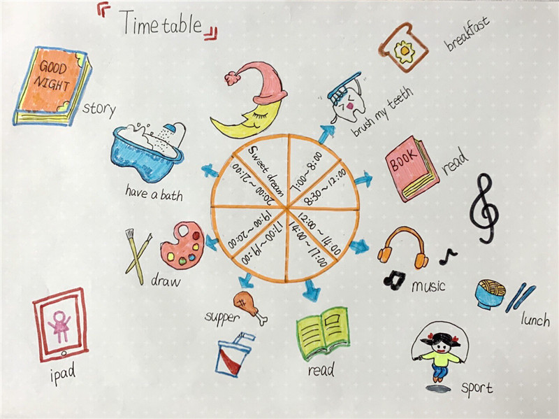 “一日作息表”上看似是一个又一个的活动,真正的意图是帮助我们去思考:我必须做什么,想做什么,不可以做什么……从而最大限度地利用好自己的每一天。“一日作息表”上不仅设置好固定的学习、作业时间,合适的起居、饮食、运动以及亲子时光也是需要考虑的。这样可以节奏分明地处理好任务和休息的关系。
