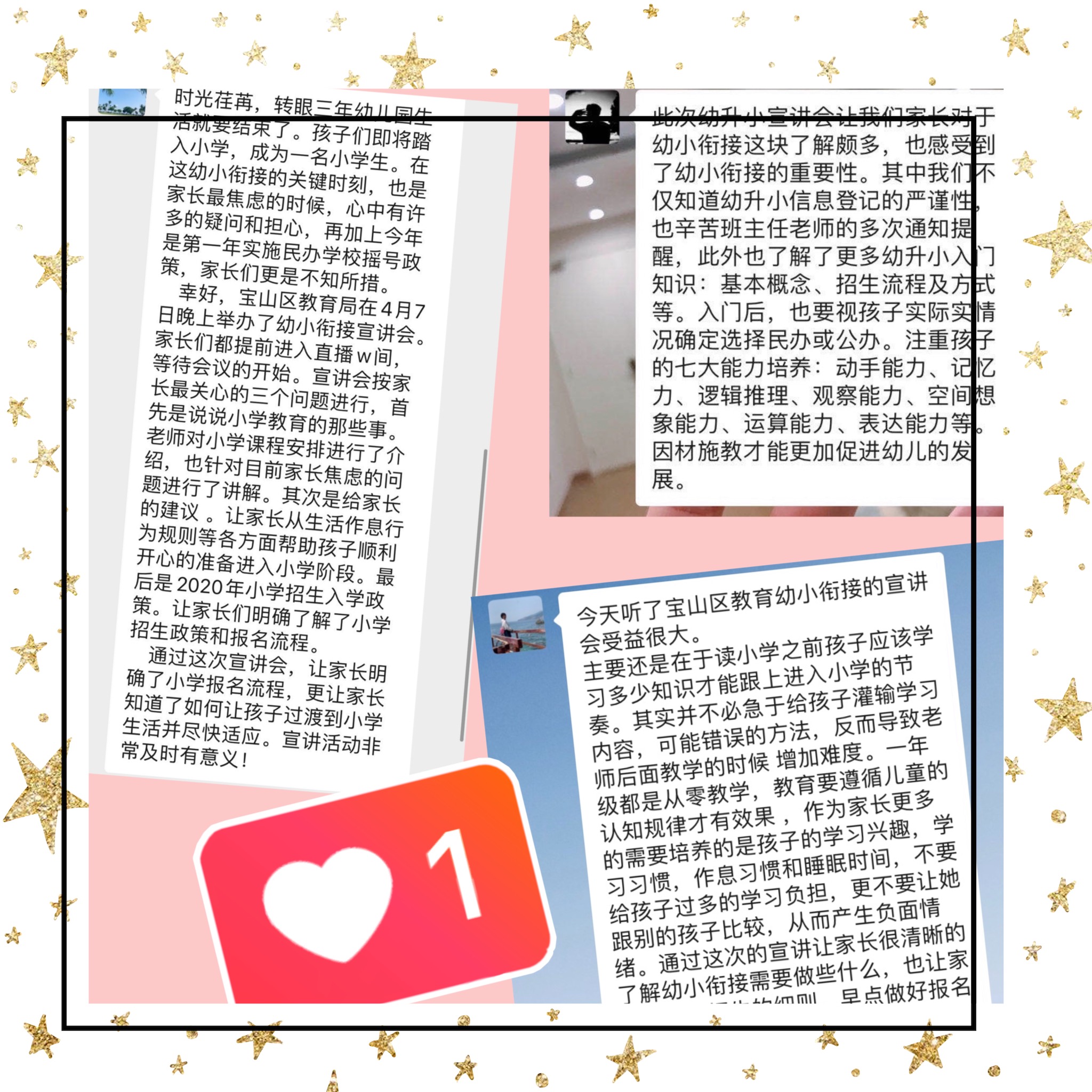 2020年4月7日,因疫情阻隔,帕堤欧幼儿园的大班家长们聆听了一场特殊的“云讲座“,宝山区幼小衔接宣讲团的老师为即将毕业踏入小学的孩子家长展开了一场线上讲座,从“说小学教育”、“议有为家长”、“讲小学招生”三方面进行了详细地讲解,为家长们普遍存在的疑问作出了详尽而又权威的解答。