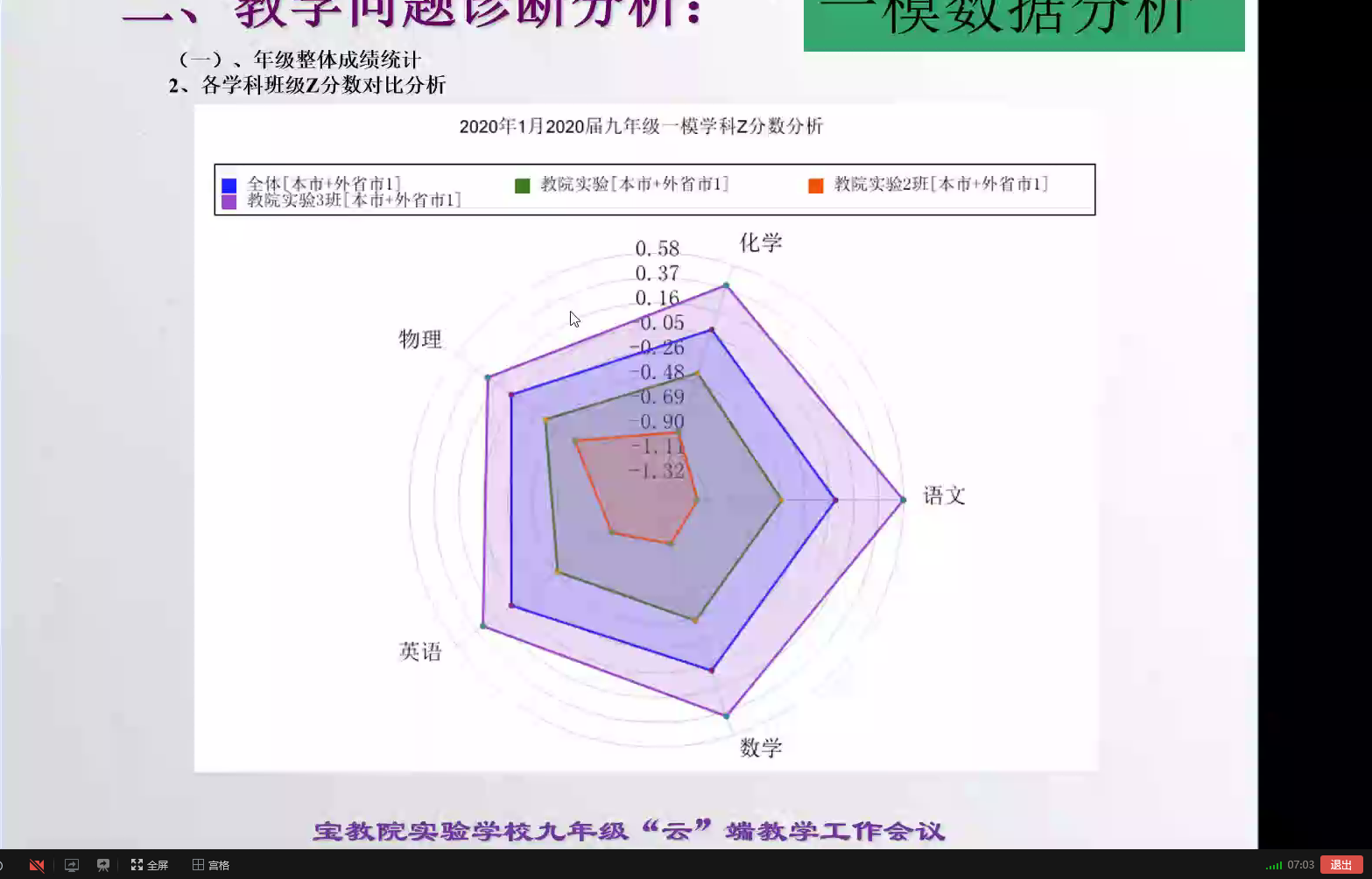 教导主任刘霞芬通过一分五率、雷达图、柱状图等形式,对本届一模考的情况做了大量的数据分析,尤其对临界生和学困生的分析,更是细致入微到每门学科的每板块知识点。同时,刘主任更是针对目前的线上教学从如何利用好双师教学模式?如何有效安排好线上作业?如何开展线上教学反馈?进行了思考,并与大家一起对线上教学进行了探讨,这让与会的老师们深受启发。