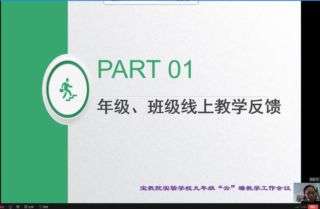 张红园、储晓慧、陆国瑛三位班主任老师就自己班级的线上学习的实际情况做了总结,主要总结了学生线上学习的出勤率、观课的认真度、互动时的积极性、作业完成的及时性、准备率、家长的配合监管等。