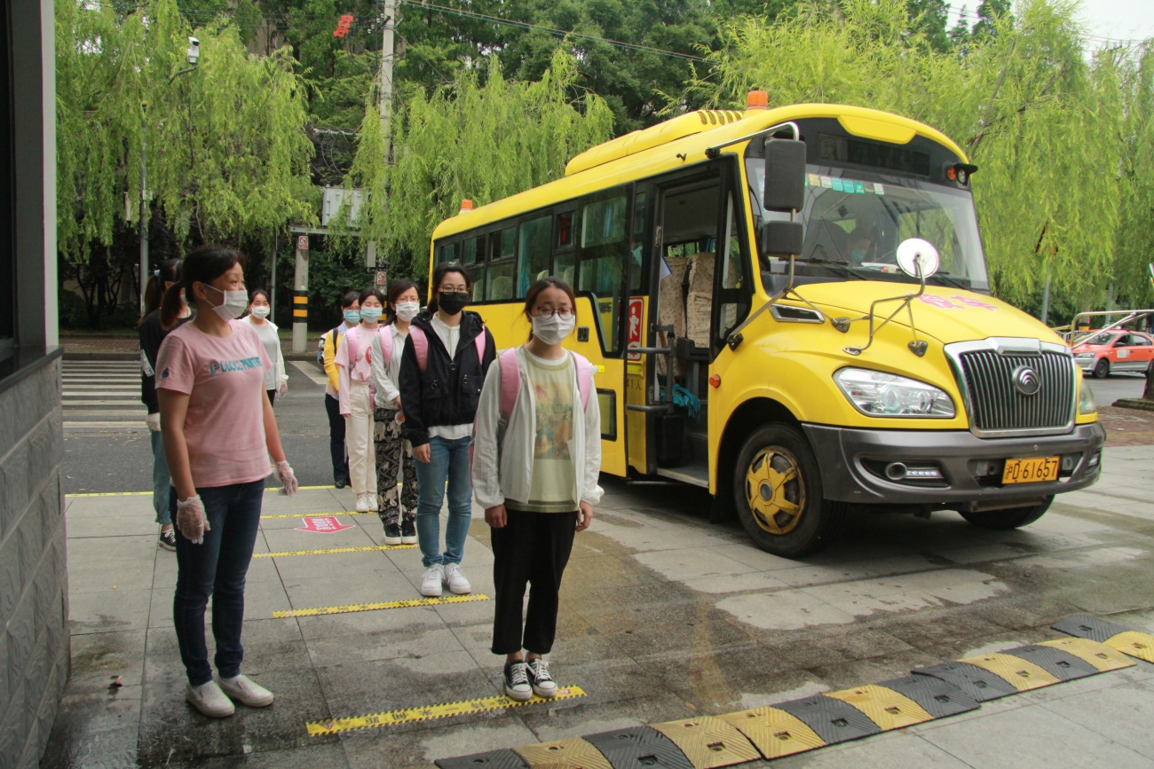 上车后间隔就坐。到校门口,有序下车排队,间隔1米以上。校车管理员维持秩序。