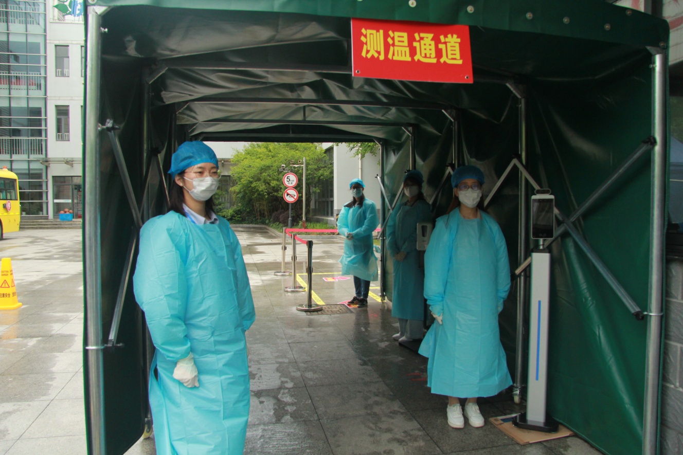 校门口晨检:测温通道,早晨由值班教师协助每一位学生测温。