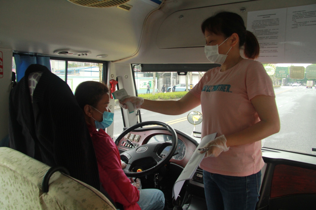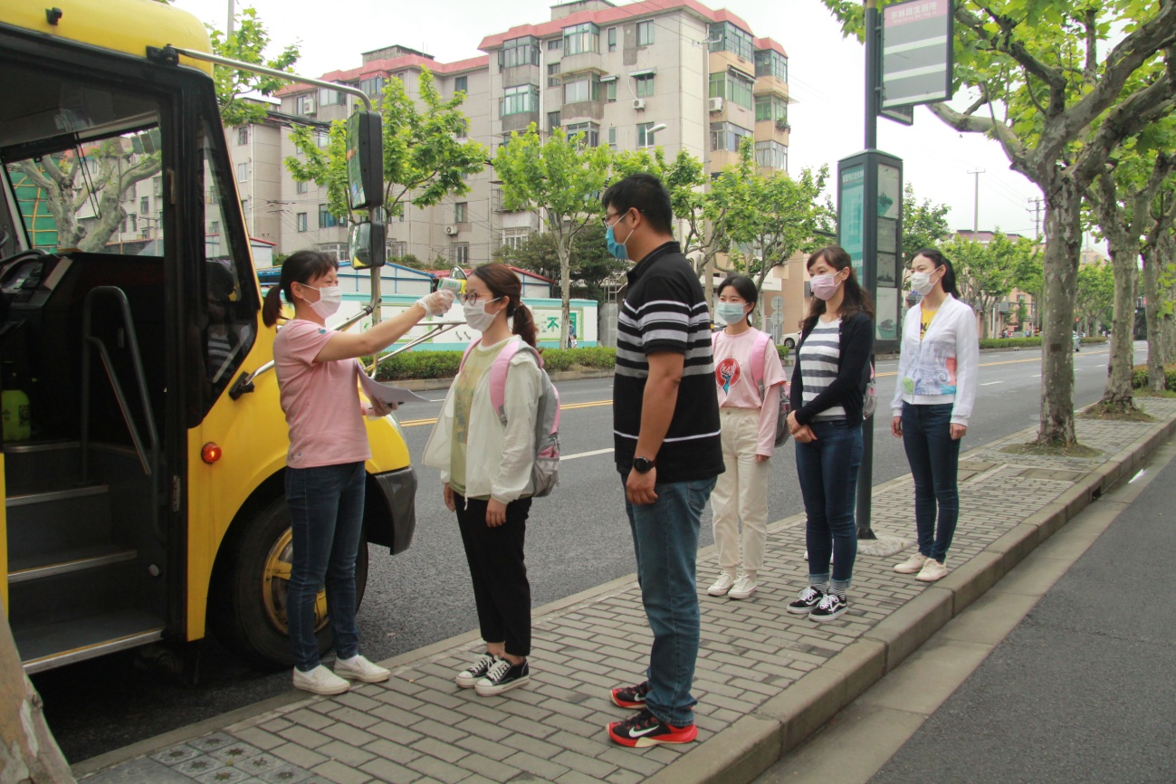 校车上学: 校车司机、校车管理员先测好体温并记录。