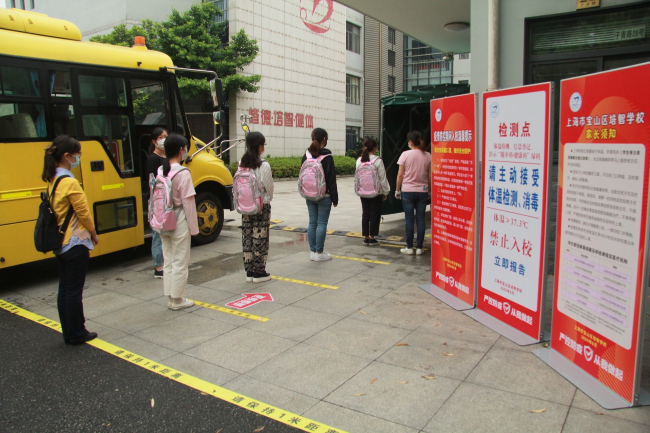 家长牵好学生,带好口罩,在指定上车点,指定时间排队,间隔1米以上。校车管理员上车前给每位学生测温并记录。
