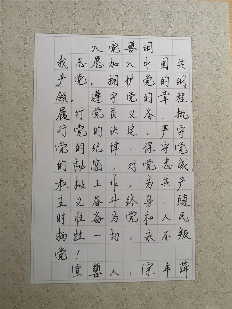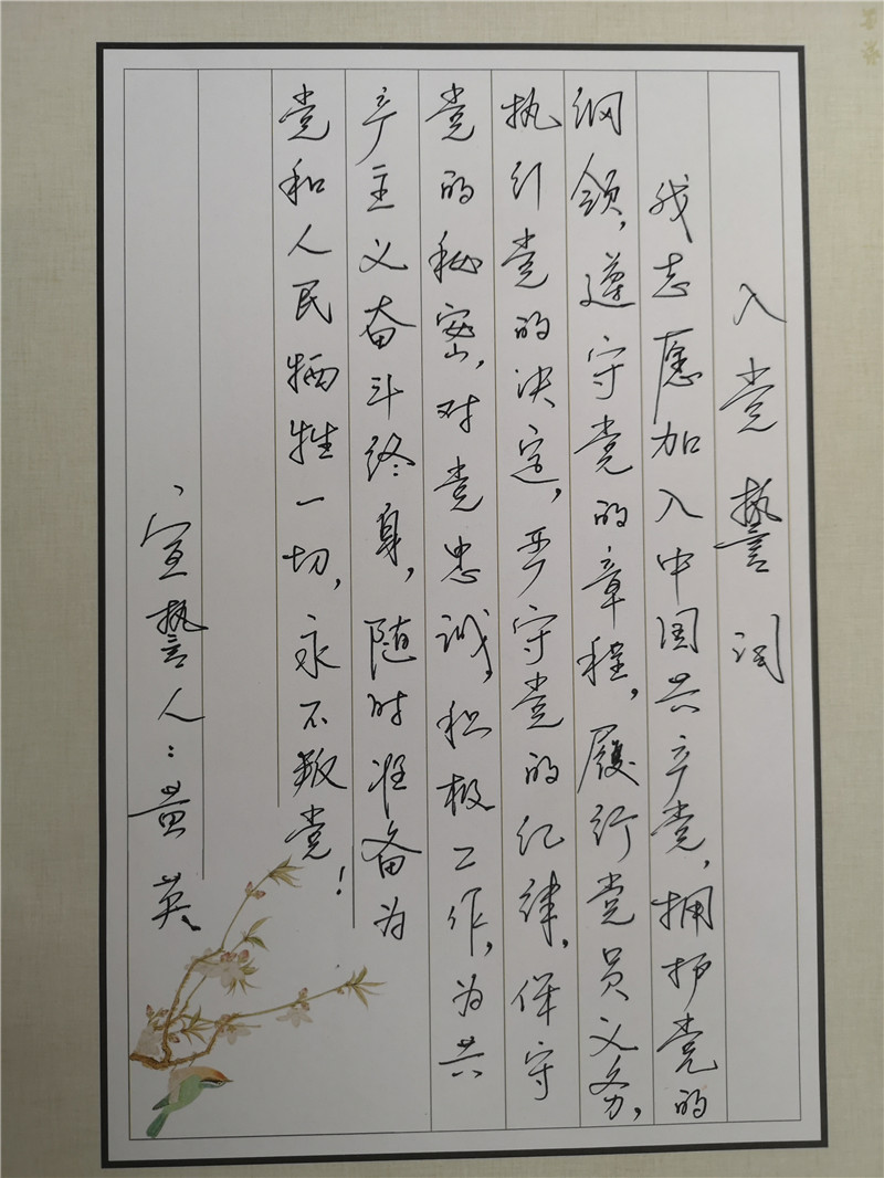 宣誓结束后,黄书记组织党员们手抄入党誓词,把自己对党的热爱、对入党的铮铮诺言倾注于笔端。党员们运用钢笔、毛笔和粉笔,逐字逐句进行抄写,用入党誓词激励自己,进一步增强组织观念和党性意识,更加坚定入党初心和政治信仰,并自觉践行入党誓词的每一句话,把责任和义务烙印于心,以实际行动争做一名优秀党员。