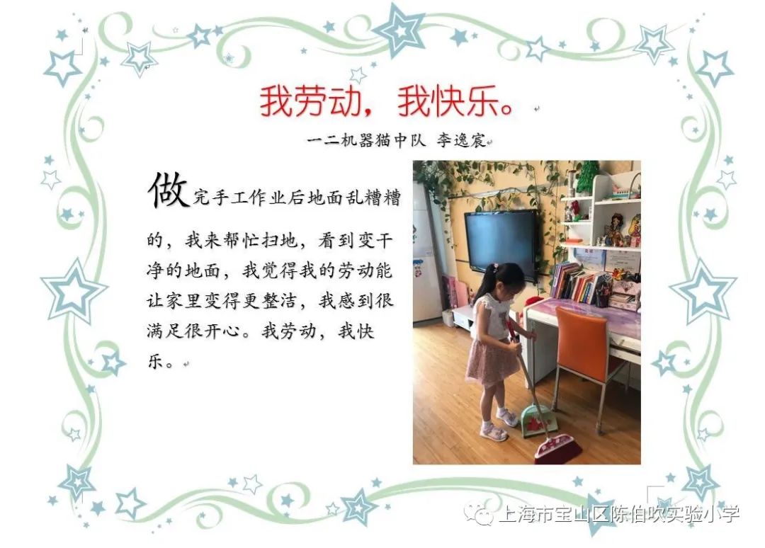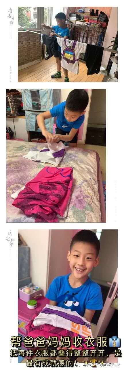 在家里,伙伴们学着主动承担力所能及的家务劳动,如打扫房间、拣菜洗碗、叠衣铺床等,并能持之以恒,形成良好的劳动习惯,懂得体贴父母的辛劳,体验劳动的乐趣和快乐。