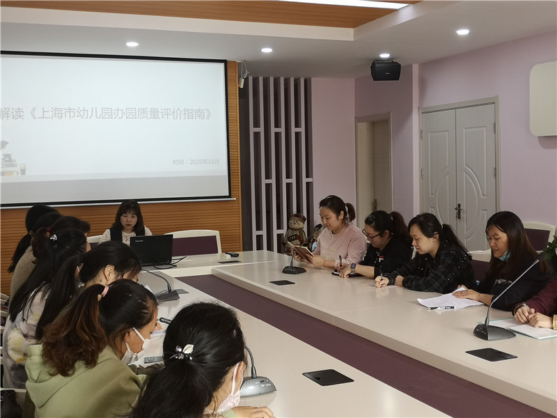 本次活动由两位工作室领衔人主持。首先,苏老师为全体成员做了《上海市幼儿园办园质量评价指南》的专题解读,苏老师从评价指南的出台背景、答疑解惑、指标体系与说明、实施建议与要求等方面进行了详尽的解读,帮助大家明晰了《评价指南》对于当前幼儿园办园优质化和教师专业化发展的重要作用。