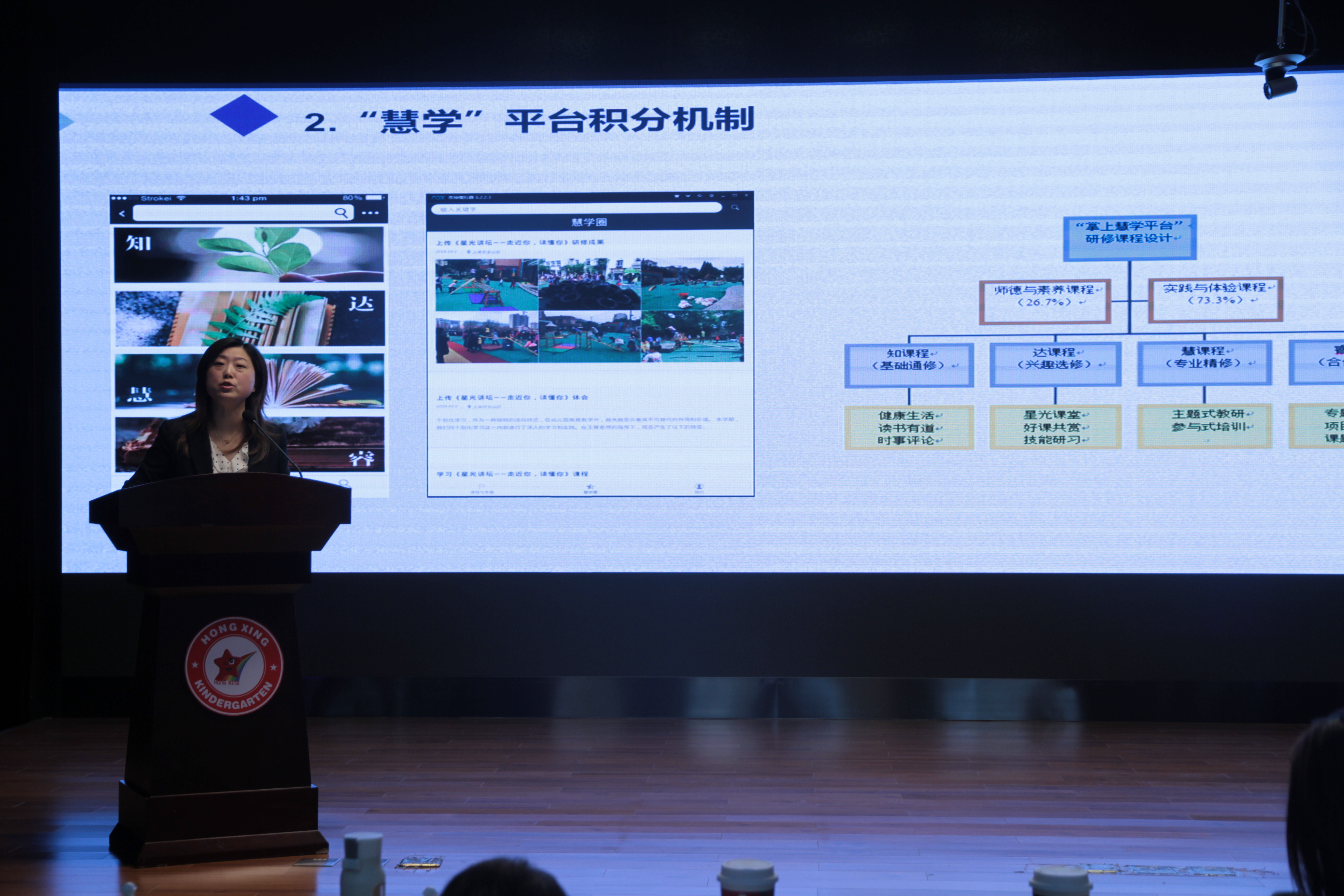 首先验收工作组听了红星幼儿园主题为“打造‘勤恳+慧学’之教师队伍”的“十三五”工作汇报,从学校基本情况介绍、主要工作经验与特色成效和存在的问题和下一阶段思考这几个方面汇报了幼儿园五年来在教师队伍建设方面所做的工作。“十三五”期间,红星幼儿园一直坚持规范与特色并举的思想,在学校内涵发展和教师职业成长之间找寻平衡点,探索最有效的培训方式,借助不同的培训平台,培养出一大批师德、师能齐发展的优秀教师,也努力将自己的成功经验无私的传授给周边学校,体现了示范辐射的作用