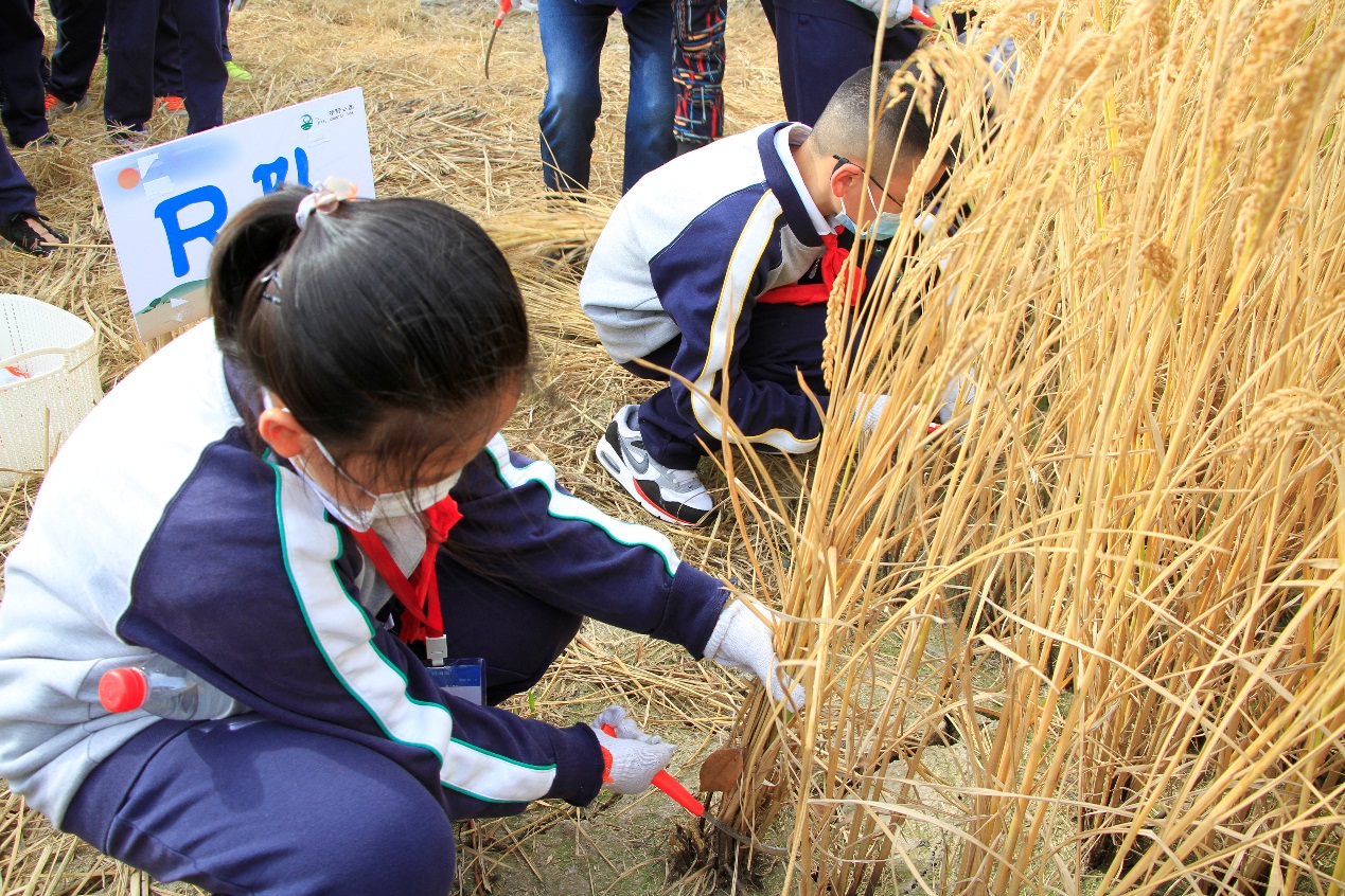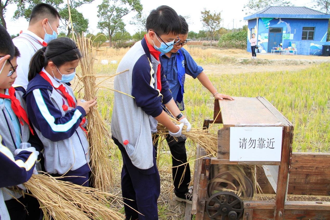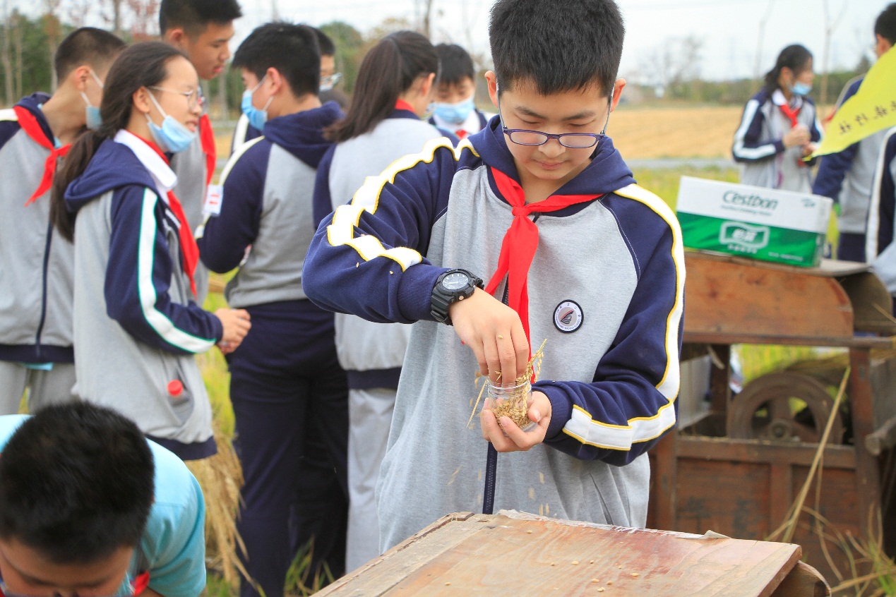 学生们首先在教练的带领下经历百问百答环节,对稻米的“一生”经历的几个环节进行了认识,并一起跳了割稻舞进行热身、随后步行到稻田中进行割稻体验收割之后在园区工作人员的指导下,同学们有序的体验了一把传统脱谷作业,在完全不插电的器械上纯人工的将稻谷从稻穗上打下来,同学们觉得新奇有趣,也深深的体会到“谁知盘中餐、粒粒皆辛苦”的深刻含义了。活动最后,同学们再将自己辛苦收割的谷粒装入小瓶中,作为伴手礼带回家。在来年的春天可以以班级为单位,将这些稻谷种子种植在校园的种植区域,看着稻谷慢慢长大的过程。