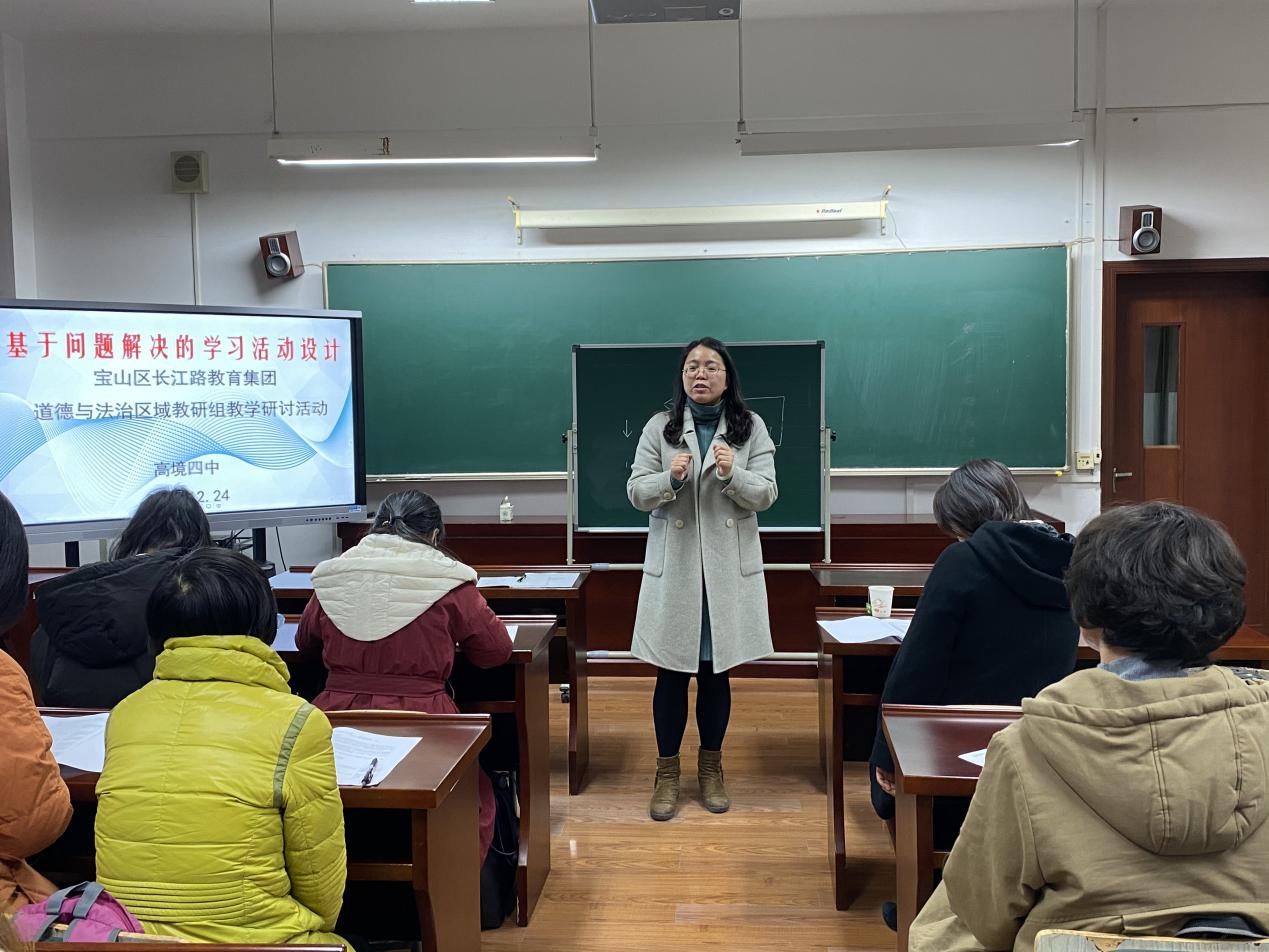 2020年12月24日上午,以“基于问题解决的学习活动设计”为主题的宝山区长江路教育集团初中道德与法治区域教研组教学研讨活动在上海市宝山区高境镇第四中学举行。参加此次研讨活动的有区道德与法治初中教研员、区域中心组长及各成员校道德与法治教师。在新中考的背景下,初中道德与法治学科的课程改革与发展要求教师在把握教材主旨的基础上,改进教学方式,引导学生在面对复杂的、不确定的现实生活情境时,综合运用结构化的学科知识和技能、学科观念、思维方法、情感态度价值观,分析情境、提出问题、解决问题、交流结果等。因此,本次活动旨在结合长江路区域学生学习的实际需求和课堂教学的现实状况,围绕基于问题解决的学习活动设计的基本结构、实施路径及策略方法等进行专题研讨。