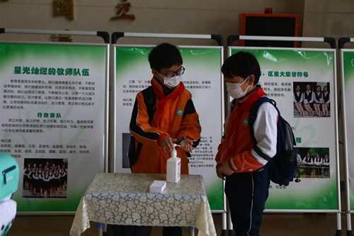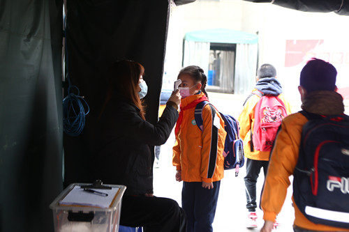 防疫不可松懈,每个进校的学生都有序测温、消毒、洗手,防疫牢牢记心间!