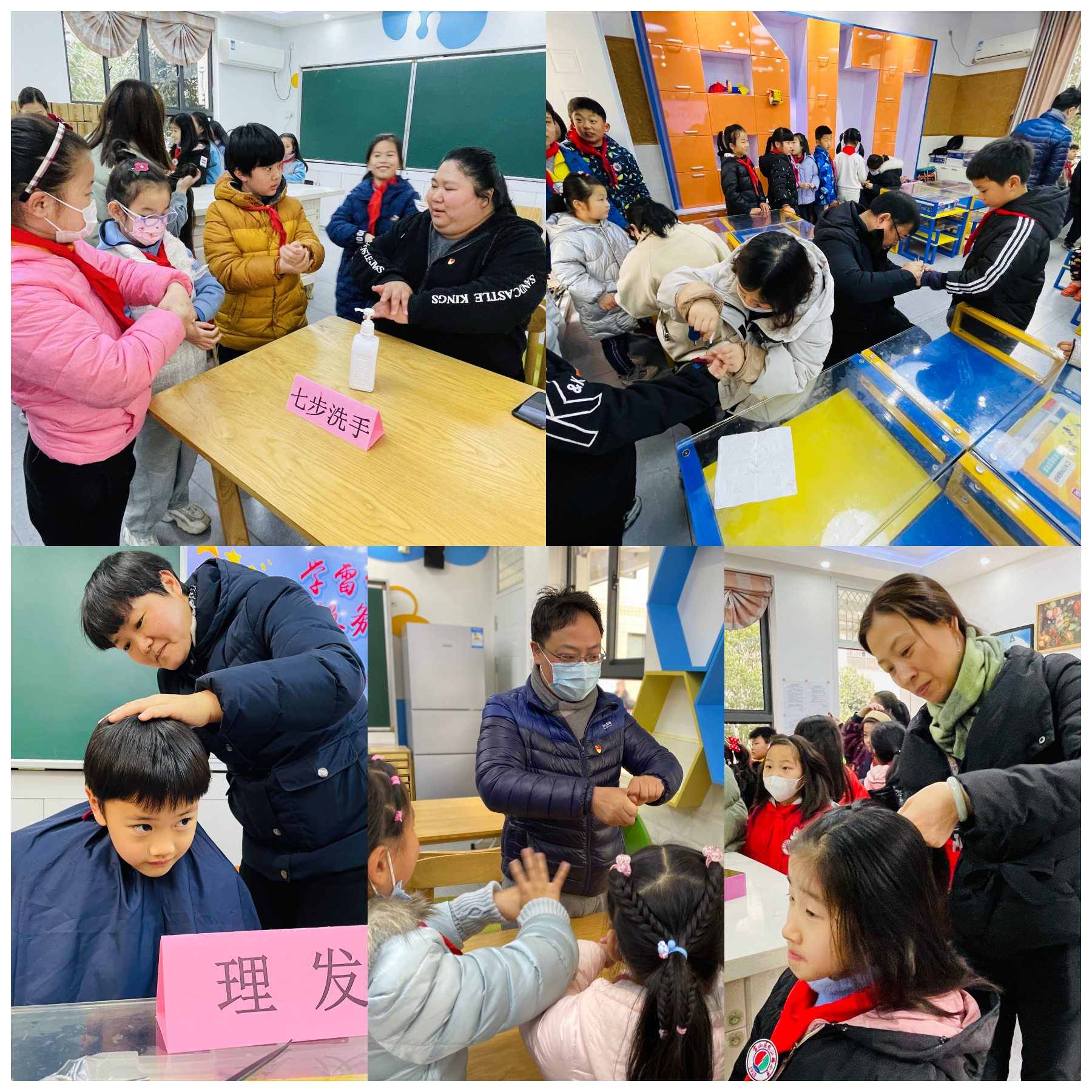 学校党、团员教师,入党积极分子组成志愿者小队开展了为学生服务活动:理发、梳发、剪指甲、防疫洗手七步洗手指导、扁担精神宣传义务讲解……此外,党员教师还参加了三村居委组织的学雷锋为民服务。