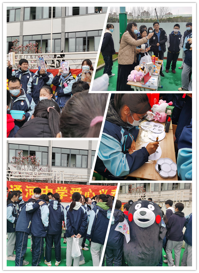 各班的准备工作历时一周,当天篮球场入口处高一同学的倾情献唱首先将同学们带入了热闹的氛围中,憨态可掬的熊本熊成为了此次活动的“吉祥物”,并与同学有爱互动。每班一个摊位,摊位前陈列着各式各样的商品:玩具、文具、书籍、装饰品等等,各班都为了能更好将自己商品卖出展现出了独特的商业头脑和反响热烈的宣传效果,有的班级高举商品吆喝叫卖,有的以抽奖形式博人眼球,有的班级请老师帮忙一起宣传、消费……一派其乐融融的热闹景象为三月的通河校园增添了许多美好。各班收摊后自觉将桌椅搬还,更有志愿者们在会场中,帮助布置摊位、维持现场秩序、打扫卫生等,体现无私的志愿者奉献精神。