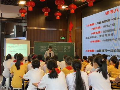 活动首先由月浦实验学校钱老师和华师大宝山实验学校孙老师分别执教长篇小说《鲁滨逊漂流记》和《钢铁是怎样炼成的》。两位老师对整本书确定核心问题和主问题,进而将问题链转化成一系列的活动任务呈现了名著导读的课堂教学。钱老师以“作者为什么要塑造鲁滨逊这个人物?”为核心问题,明确核心任务“为鲁滨逊写一篇人物小传”,带领六年级学生走进小说这类文体。孙老师以“作者为何以《钢铁是怎样炼成的》作为小说的题目?”为核心问题,并转化为核心任务——以《让我告诉你,钢铁是这样炼成的!》为题目,完成一篇读后感,基于八年级学生学情,提供学生小说的阅读路径。